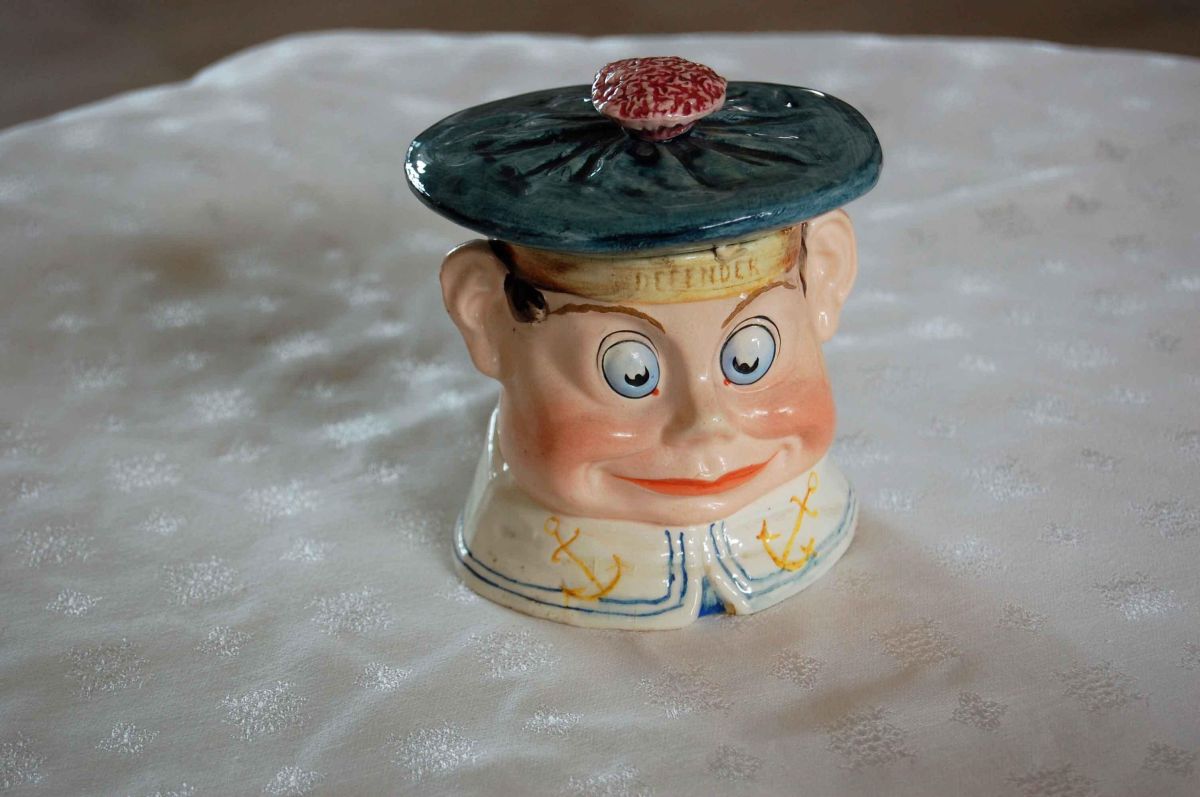 "Defender" Tobacco Humidor. Brownie in sailor attire, defender on cap. Excellent condition. 5 1/8 inches tall.