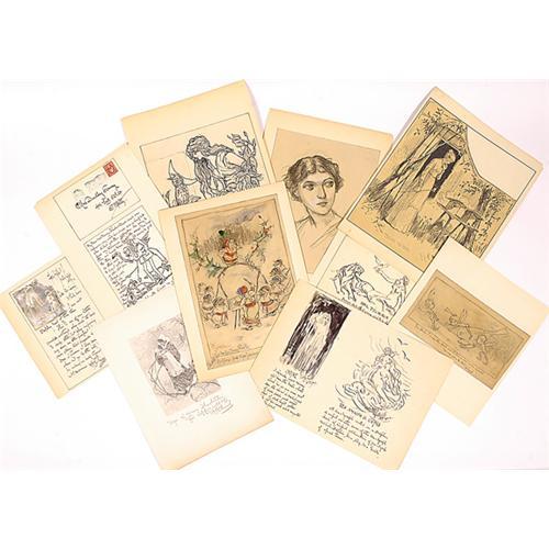 <Our item number 139944><B>Church, Frederick S.</B> (1842-1924) American Artist and Illustrator. After serving in the Civil War, Church studied at the Chicago Academy of Design, and later at New York's Academy of Design and the Art Students League. His illustrations were printed in numerous American periodicals such as Harper's Weekly and Harper's Bazaar. Best known for his drawings of birds and animals of all kinds, he often endowed them with human and humorous characteristics.<BR><BR>An extensive, mostly signed, collection of approximately 100 pieces: drawings, sketches, watercolors, etchings, engravings, photos and letters. In all, over 50 original delightful drawings and sketches (many annotated) of humans, cupids, mermaids, intermingled with an array of animals, done in a variety of medium: pen & ink, charcoal, pencil, pencil & watercolor, ranging in size from 4 x 5 in. to 12 x 19 in., dating from 1878 to 1917. ALSO included, 4 autograph letters signed (one with photo) , 1 autograph note signed, 31 signed engravings, a CDV of young Church in Civil War uniform, a set of silhouette postage stamps, the title page of "Uncle Remus" (pub. 1887) illustrated by Frederick S. Church, as well as numerous mounted newspaper clippings and magazine articles detailing Church's life and works. Original Frederick S. Church watercolors and drawings such as in this collection have been bringing between $350 to $4,000 each. <BR><BR>A wonderful collection; should be seen in person to be appreciated. For a detailed descriptive list, please inquire. <BR>Estimated Value $10,000 - 15,000. <BR><BR>Our item number 139944<BR><IMAGES><P ALIGN="CENTER"><IMG SRC="http://www.goldbergcoins.net/liveauction/49jpegs/139944.jpg"> </P></IMAGES>