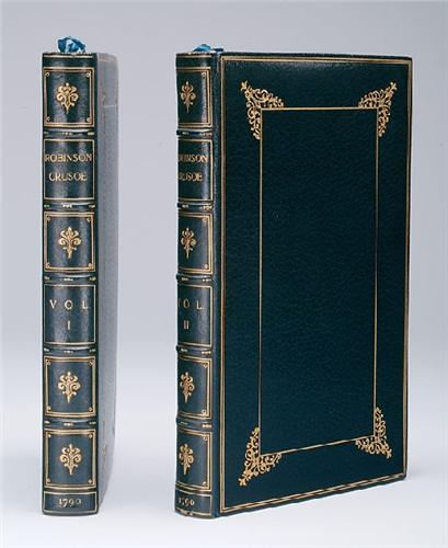 Defoe, Daniel. THE LIFE AND SURPRIZING ADVENTURES OF ROBINSON CRUSOE. 2 volumes, 389 p., 456 p. and 14 pages of ads. Engraved titles and plates after Stothard. Large 8vo, full dark blue morocco with gilt borders and decorative devices on top board, 5 spine bands forming 6 compartments with gilt, marbled endpapers, aeg and internally clean. A handsome binding stamped by Bayntun of Bath.