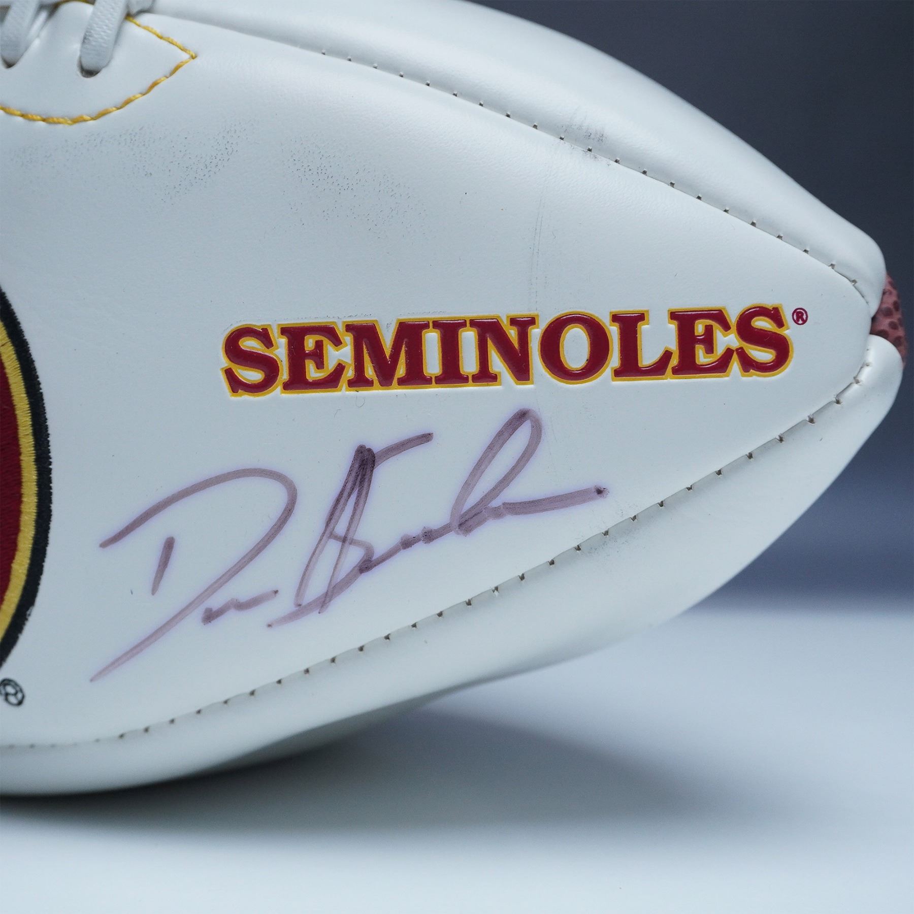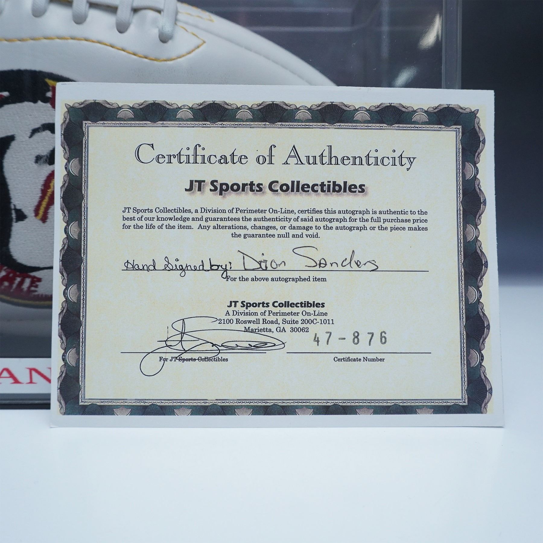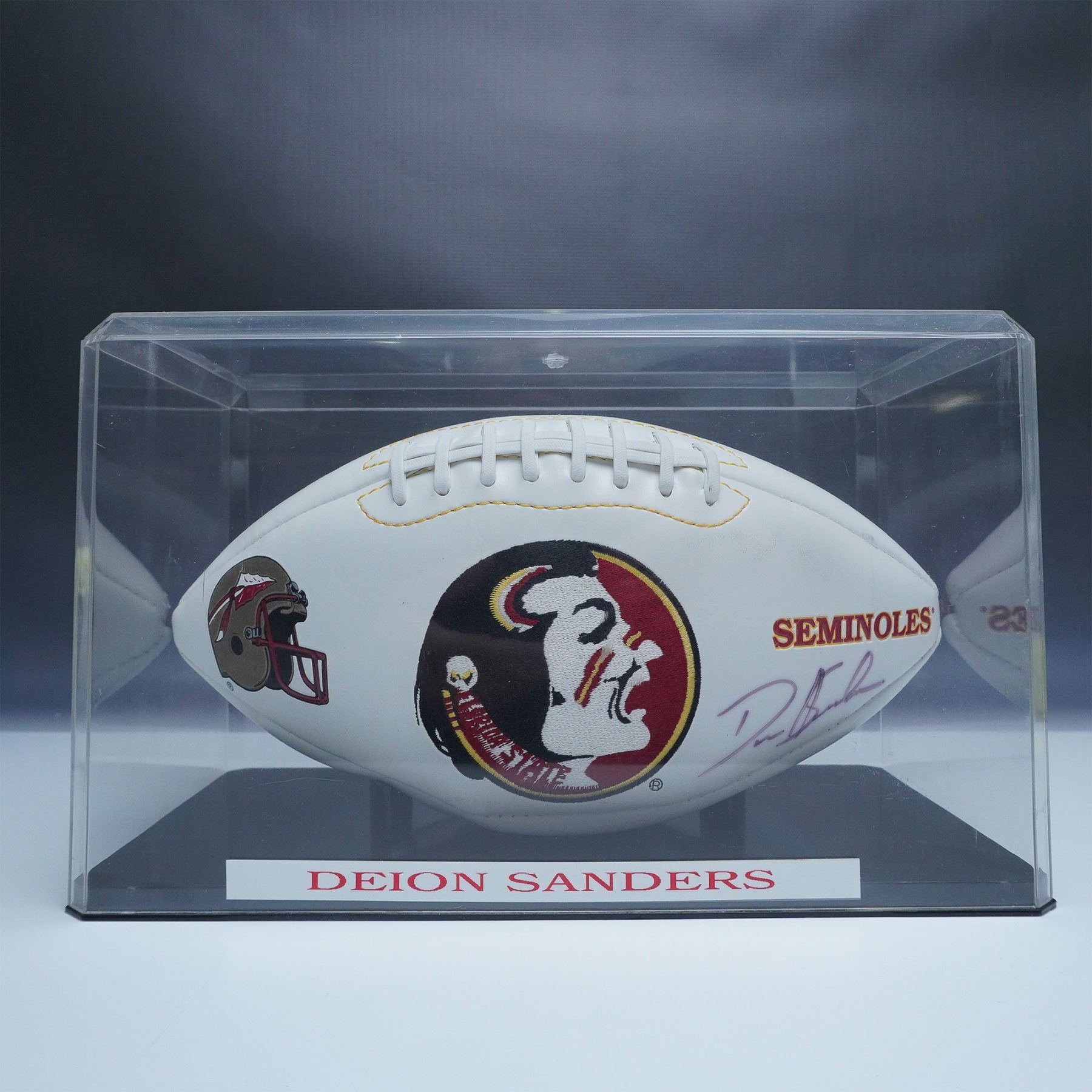 Officially licensed Florida State Seminoles white panel football, hand-signed by legendary cornerback Deion Sanders in bold ink. This collectible football features the FSU Seminoles logo, helmet graphic, and embroidered team name, making it a standout display piece. Includes a Certificate of Authenticity from JT Sports Collectibles, guaranteeing the authenticity of the signature. Housed in a protective display case, this item is a must-have for FSU fans and football memorabilia collectors.