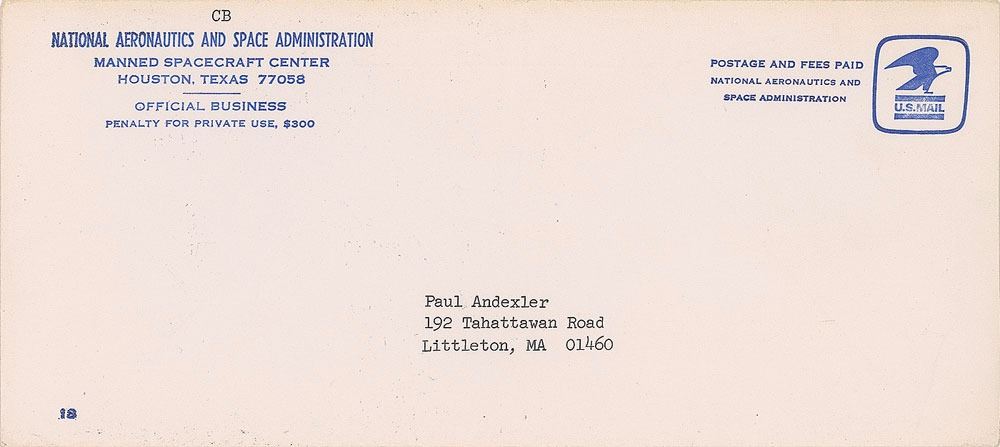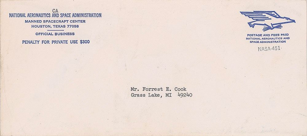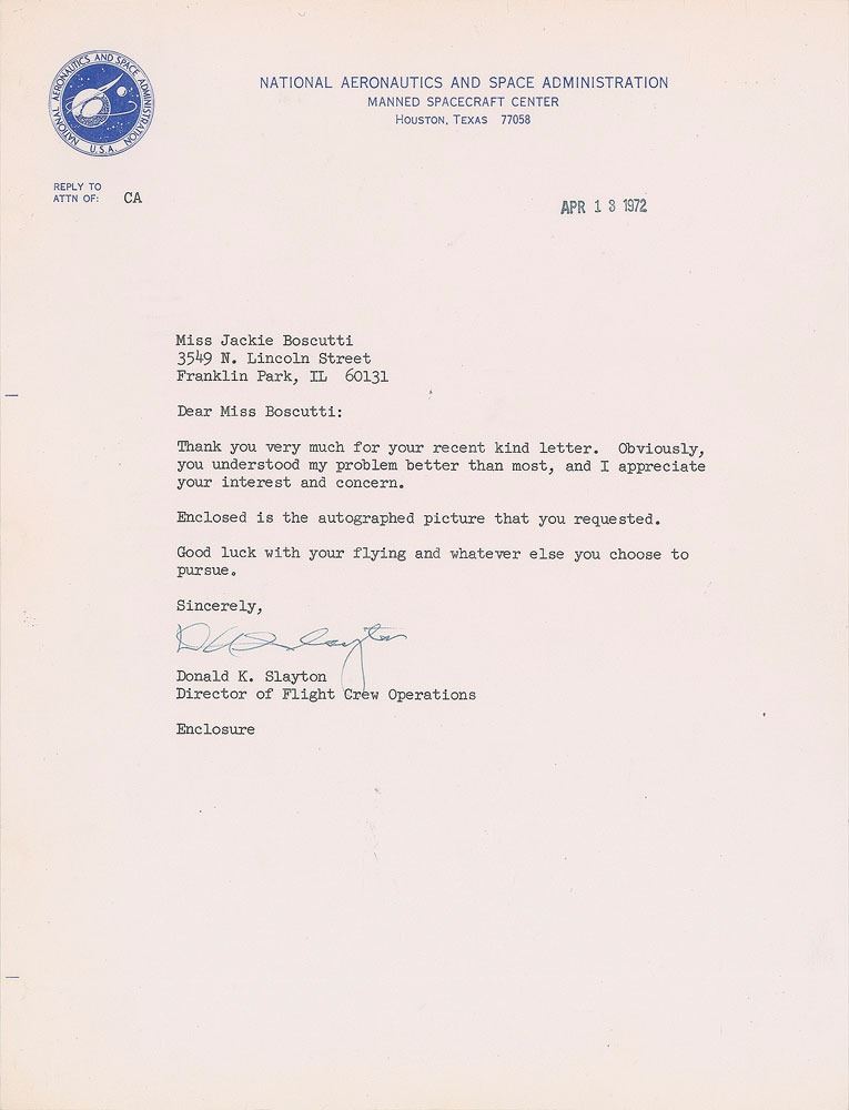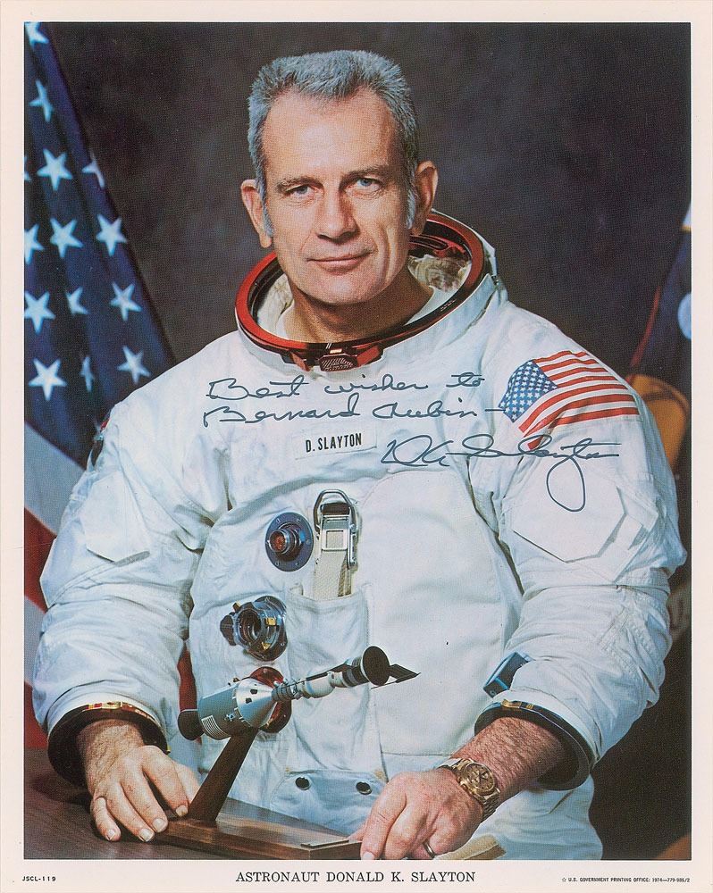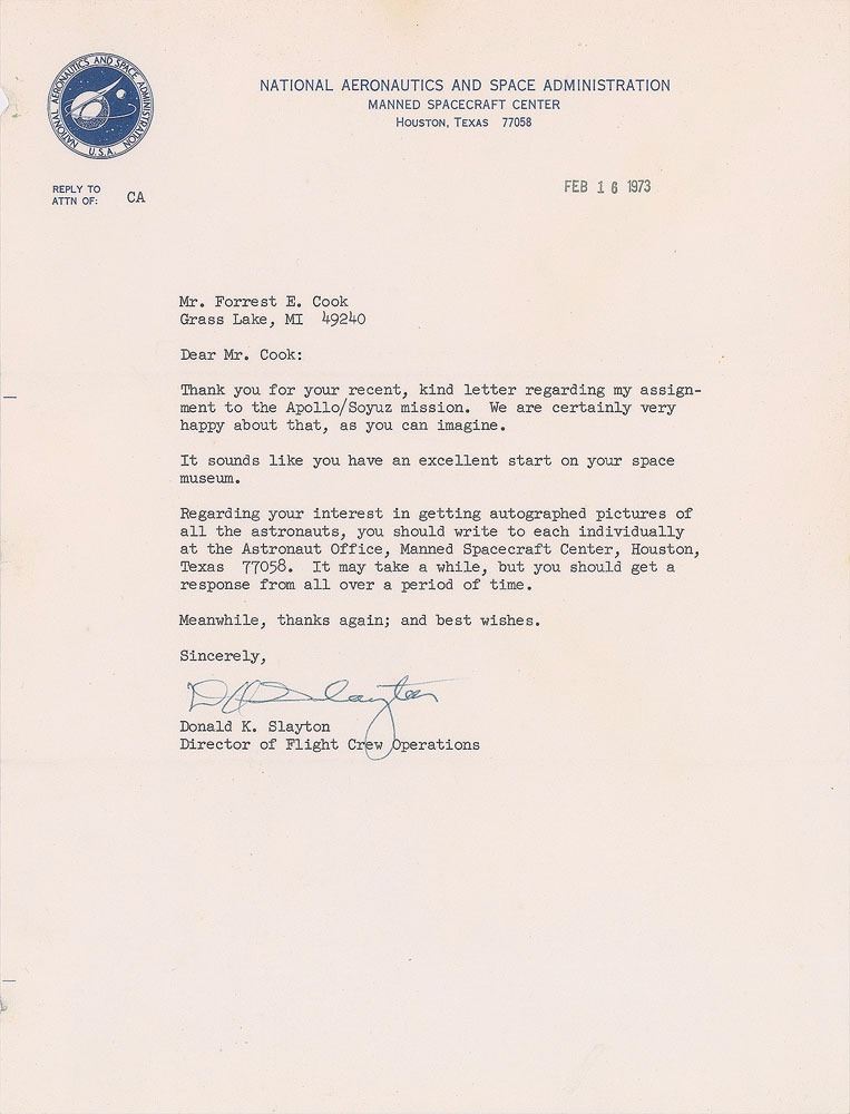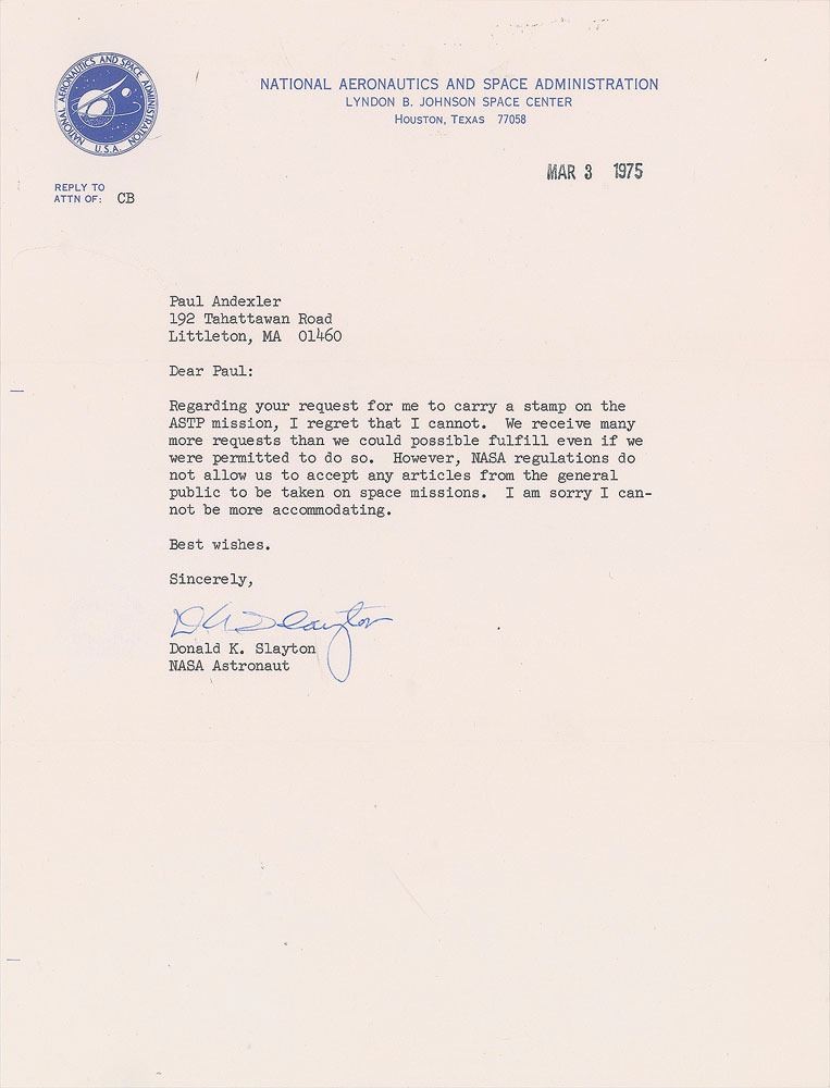 Group of four signed items, including three TLSs and a signed photo. All TLSs are signed "D. K. Slayton," and are one page on NASA letterhead, dated to the 1970s. The first, April 13, 1972, in part: "Good luck with your flying and whatever else you choose to pursue." The second, February 16, 1973, in part: "Thank you for your recent, kind letter regarding my assignment to the Apollo/Soyuz mission. We are certainly very happy about that, as you can imagine." The third, March 3, 1975, in part: "Regarding your request for me to carry a stamp on the ASTP mission, I regret that I cannot…NASA regulations do not allow us to accept any articles from the general public to be taken on space missions." The signed photo is an official color 8 x 10 NASA lithograph of Slayton in his white ASTP space suit, signed and inscribed in black felt tip, "Best wishes to Bernard Rubin—D. K. Slayton." In overall fine condition. Accompanied by the original mailing envelopes for two of the letters, and a sheet of 1975 Apollo-Soyuz postage stamps.