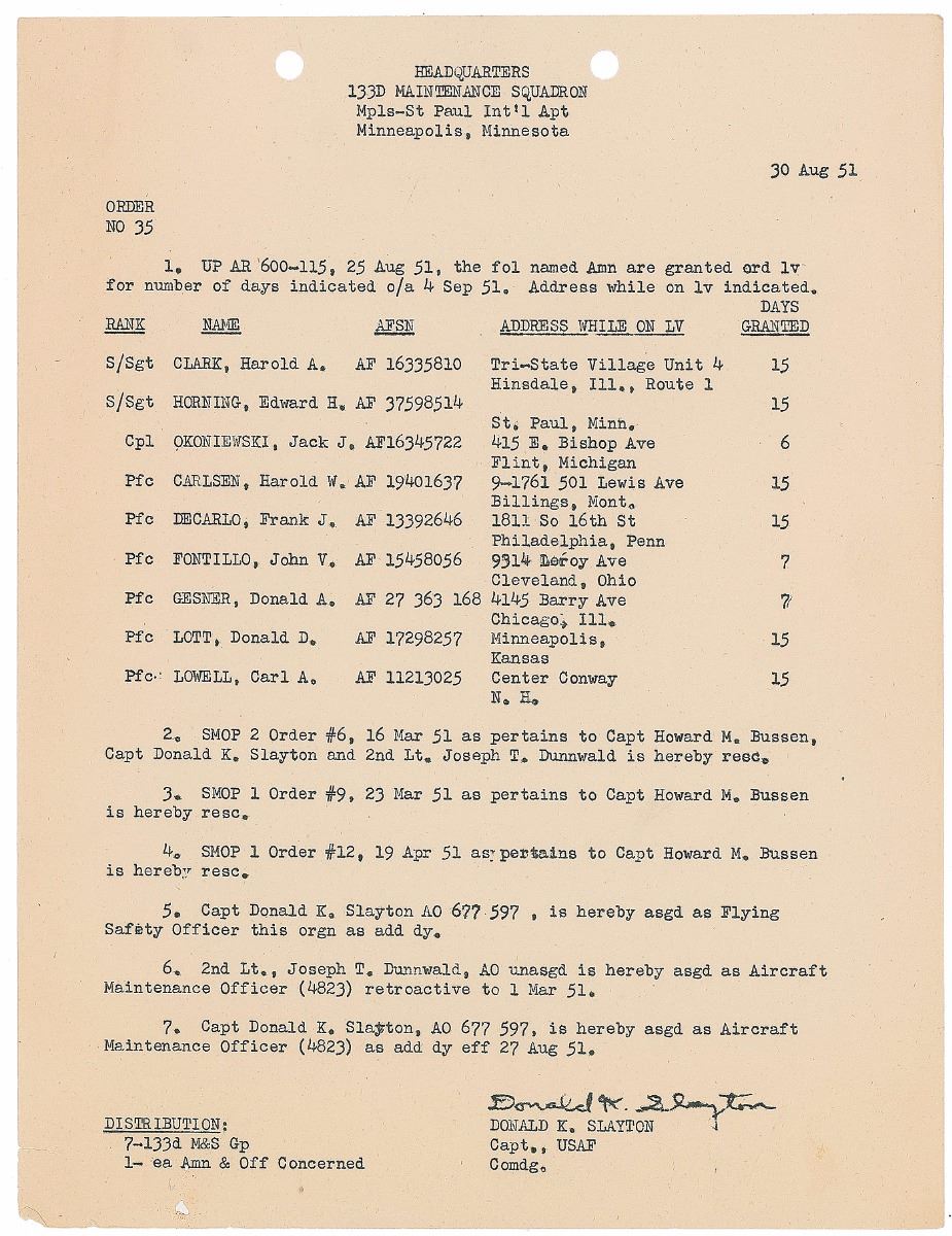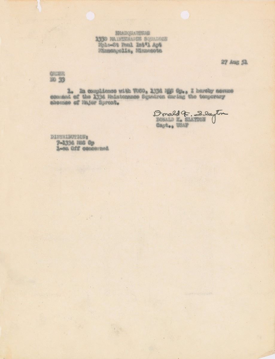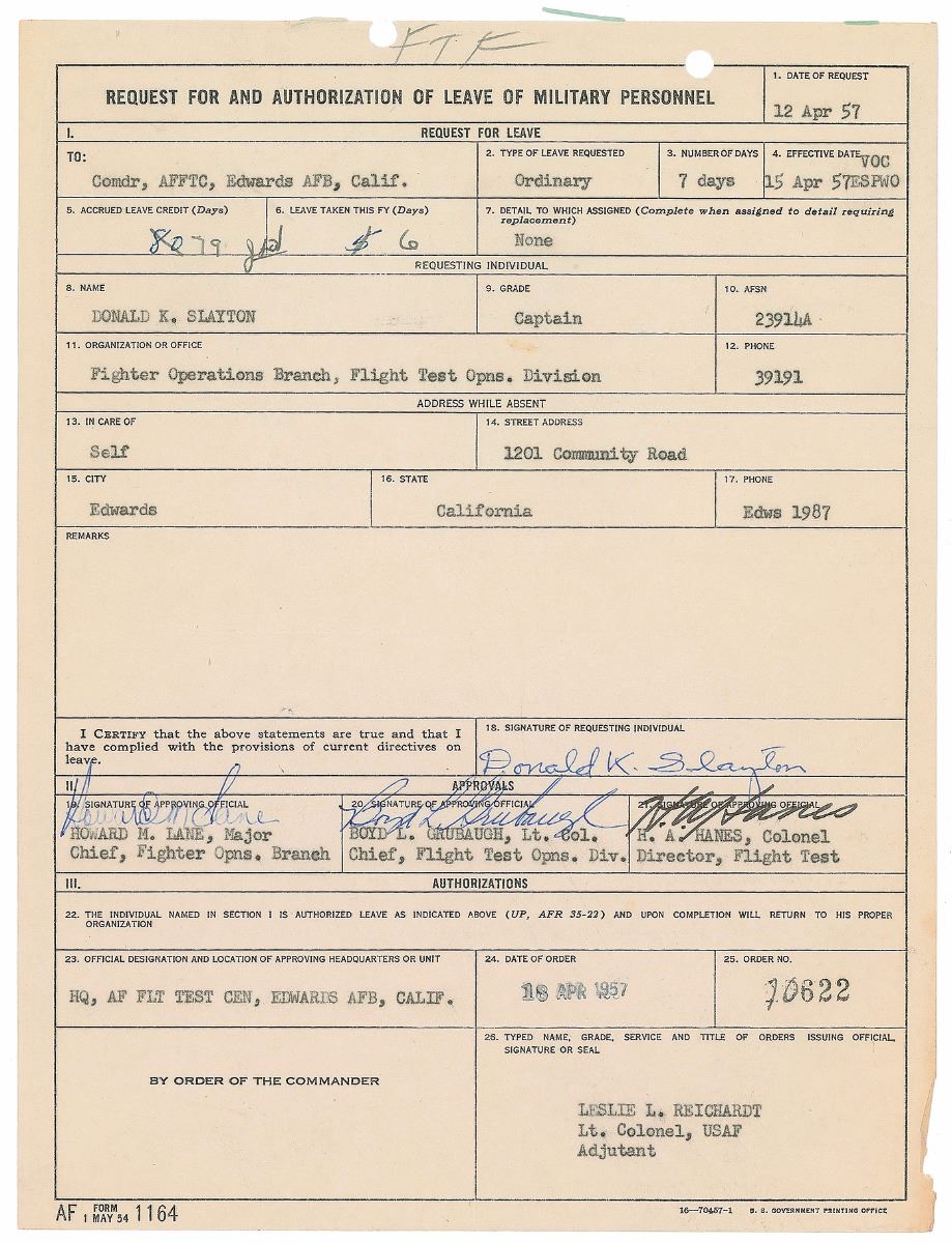DS, signed “Donald K. Slayton,” one page, 8 x 10.5, May 12, 1957. Official form for requesting a military leave in which Captain Slayton of the “Fighter Operations Branch, Flight Test Opns. Division” requests a seven-day leave. Signed at the conclusion in ballpoint by Slayton as the requesting individual and countersigned by three officers with their approval. Also includes two documents bearing autopen and pre-printed Slayton signatures, as well as an original mimeographed ‘Special Orders’ document. In very good to fine condition. From the collection of aerospace memorabilia specialist Ken Havekotte.