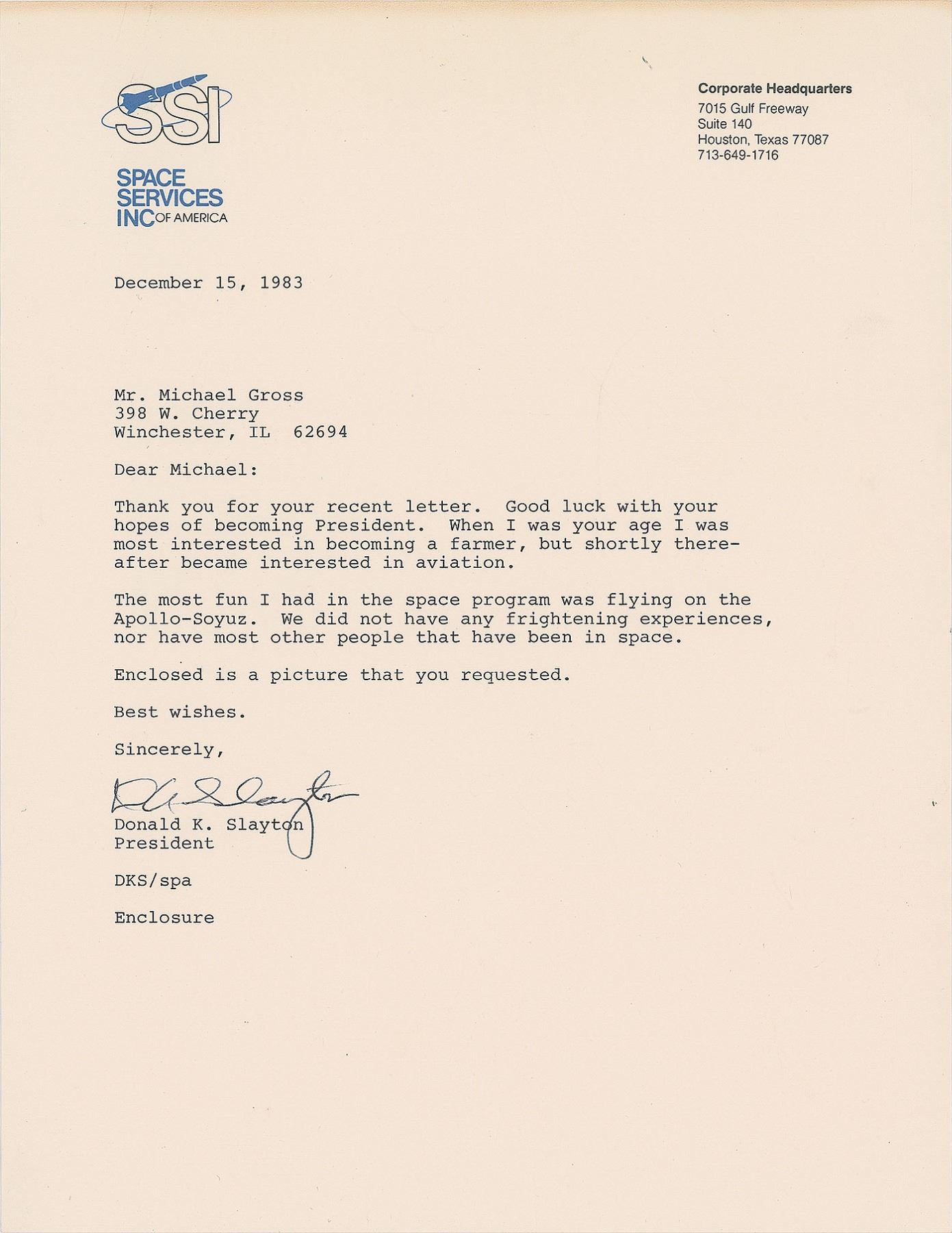 Two items: an official color 8 x 10 NASA lithograph of Slayton posing in his white space suit with a model of the docked Apollo–Soyuz Test Project spacecrafts, signed and inscribed in black ballpoint, "Best wishes to Ron Fendrick, DK Slayton"; and a TLS signed "DK Slayton," one page, 8.5 x 11, Space Services Inc. of America letterhead, December 15, 1983, addressed to a young fan, in part: “When I was your age I was most interested in becoming a farmer, but shortly thereafter I became interested in aviation. The most fun I had in the space program was flying on the Apollo-Soyuz. We did not have any frightening experiences, nor have most other people that have been in space.” In overall fine condition.