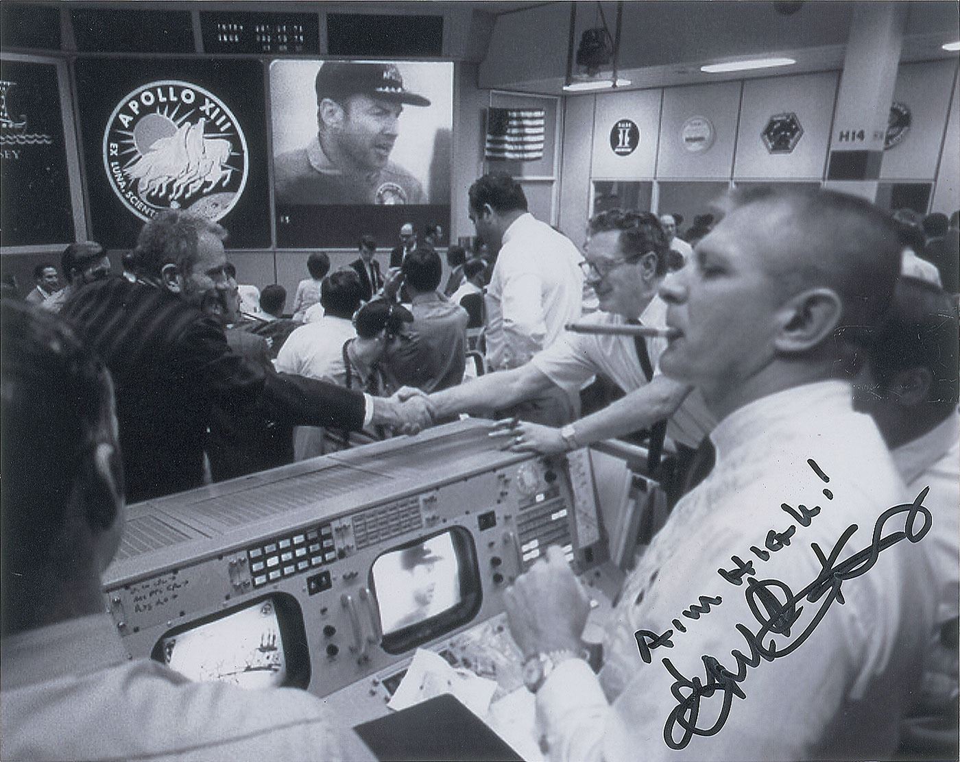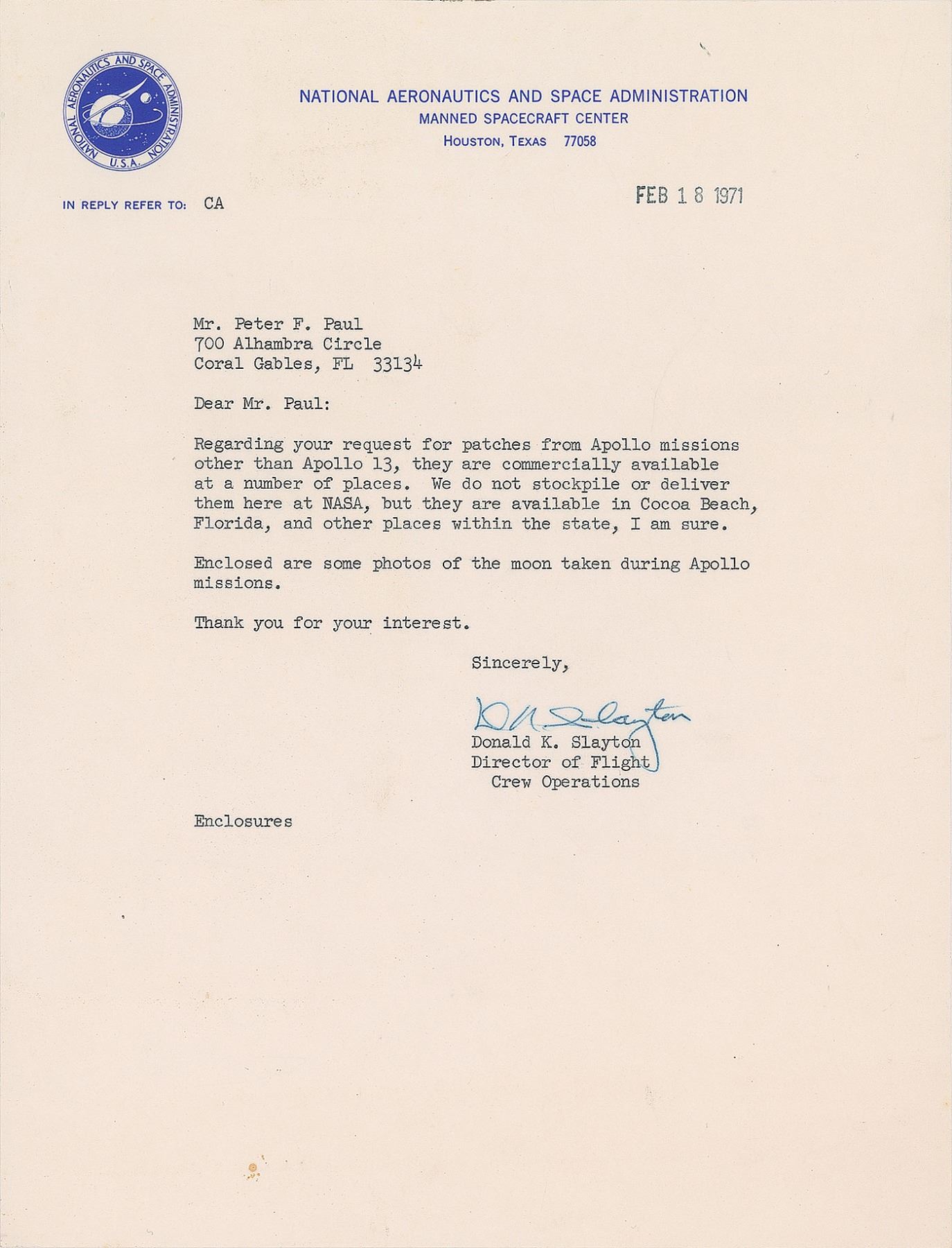 Two items: a TLS signed “DK Slayton,” one page, NASA letterhead, February 18, 1971, letter to Peter F. Paul, in part: “Regarding your request for patches from Apollo missions other than Apollo 13, they are commercially available at a number of places. We do not stockpile or deliver them here at NASA, but they are available in Cocoa Beach, Florida, and other places within the state, I am sure"; and a semi-glossy 10 x 8 photo of Gene Kranz lighting up a cigar in mission control, celebrating the safe return of the Apollo 13 crew, signed in black felt tip, "Aim high! Gene F. Kranz." In overall fine condition.