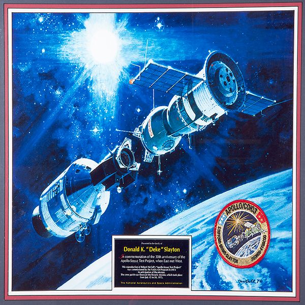 Deke Slayton’s Apollo-Soyuz 30th Anniversary "Presentation" – With Flown Crew Patch. Very nicely framed with a triple matt (red, white and blue) this reproduction of Robert McCall’s "Apollo-Soyuz Test Project" painting is simply outstanding! The plaque reads "Presented to the family of Donald K. "Deke" Slayton. In commemoration of the 30th Anniversary of the Apollo-Soyuz Test Project, when East met West. This reproduction of Robert McCall’s "Apollo-Soyuz Test Project" was commissioned by the NASA Art Program in anticipation of the mission. The crew patch was flown on the historic mission, which took place from July 15 to 24, 1975." The signoff is "The National Aeronautics and Space Administration". Ex. the Astronaut Donald K. "Deke" Estate Collection.