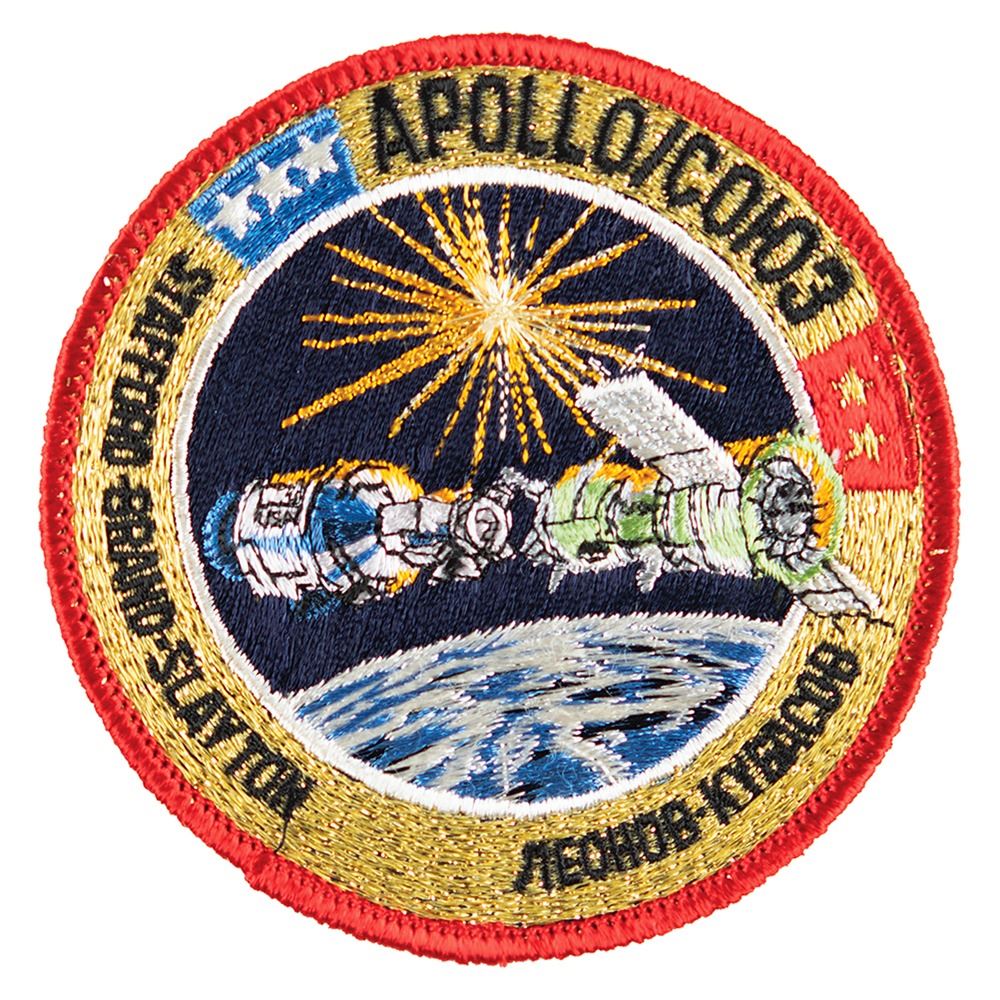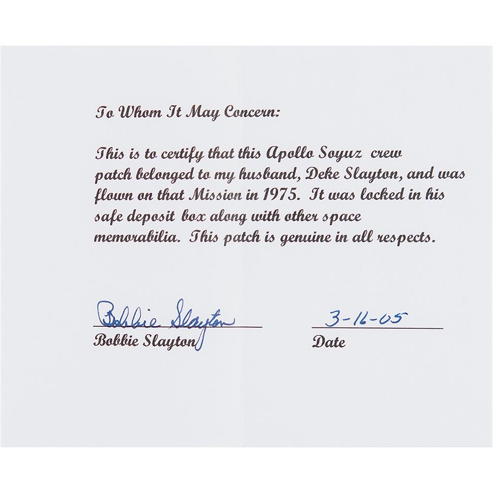 Deke Slayton's embroidered Apollo–Soyuz Test Project mission patch attested to as being flown aboard the Apollo CSM-111 for nine days in space, 4Ë in diameter, fully embroidered with a merrowed edge and ‘tail.’ In fine condition. Accompanied by a certificate of authenticity signed by his wife, Bobbie Slayton, which reads in part: "This is to certify that this Apollo Soyuz crew patch belonged to my husband, Deke Slayton, and was flown on that mission in 1975. It was locked in his safe deposit box along with other flown memorabilia."