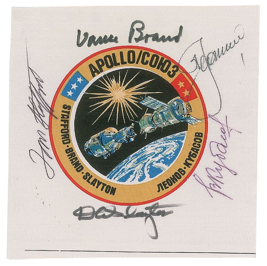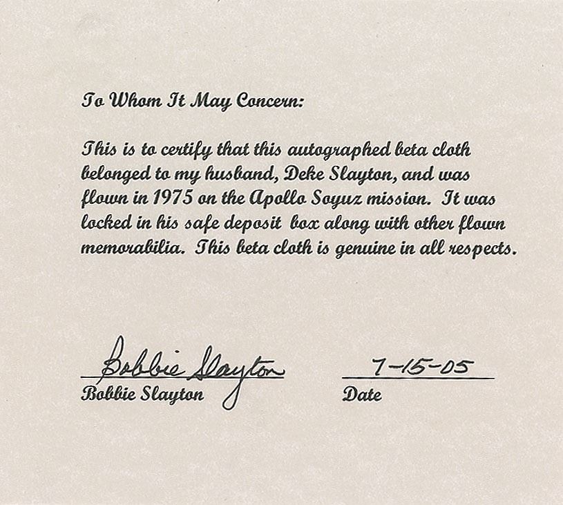 Deke Slayton's flown 5.5 x 5.5 swatch of Beta cloth featuring the ASTP mission insignia, carried aboard the Apollo CSM-111 for nine days in space, signed in black ink or felt tip by Deke Slayton, Tom Stafford, Vance Brand, Alexei Leonov, and Valery Kubasov. In fine condition. Accompanied by a certificate of authenticity signed by his wife, Bobbie Slayton, which reads, in part: "This is to certify that this autographed beta cloth belonged to my husband, Deke Slayton, and was flown in 1975 on the Apollo Soyuz mission. It was locked in his safe deposit box along with other flown memorabilia. This beta cloth is genuine in all respects."