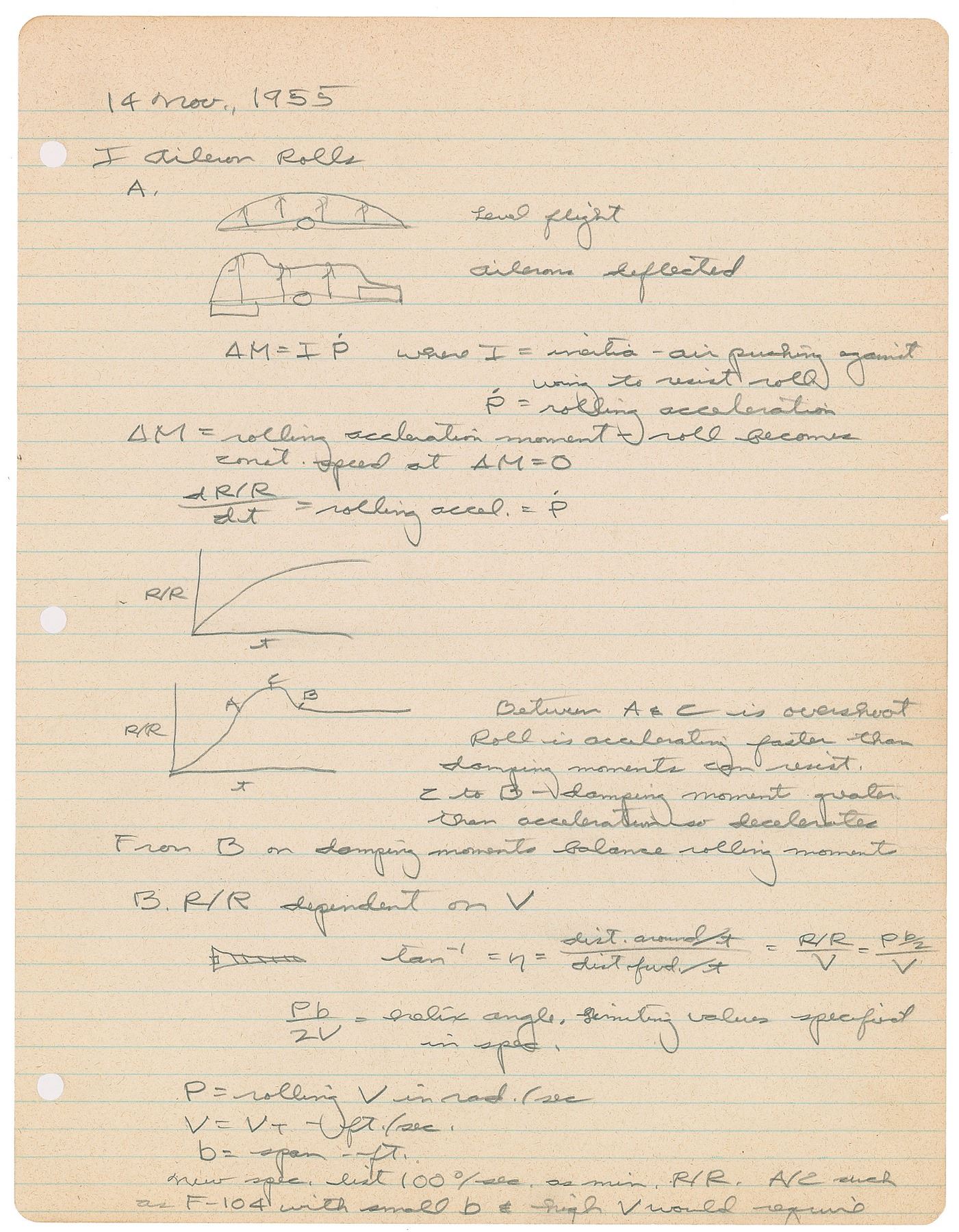 Three pages of Slayton's handwritten notes in pencil from his time as a student at the USAF Experimental Flight Test School: one 8.5 x 11 loose-leaf notebook page dated November 14, 1955, featuring notes, charts, equations, and diagrams related to "Aileron Rolls"; a second undated loose-leaf page with notes on force and friction; and a hand-drawn graph, "Cylinder Head Temperature vs. Cooling Flap Position," accomplished on an 11 x 7.75 sheet of graph paper. Also includes a copy of Slayton's "Student Flight Record" sheet for a flight test on September 2, 1955. In overall fine condition, with a small edge tear to the first page of notes. Accompanied by a certificate of authenticity from aerospace memorabilia specialist Ken Havekotte, stating that these papers came from those written by Slayton during his series of performance flight tests and studies between July 28 and December 2, 1955.