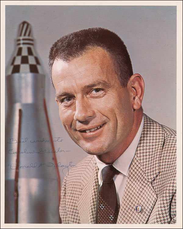 Early color vintage 8 x 10 NASA close-up photo, signed and inscribed in blue ballpoint “Best wishes to Caroline Gessler, Donald K. Slayton.” Some scattered light surface marks, and a paperclip impression and creasing to top edge, otherwise fine condition. Slayton signed with his full name for only a brief time early in his NASA career.