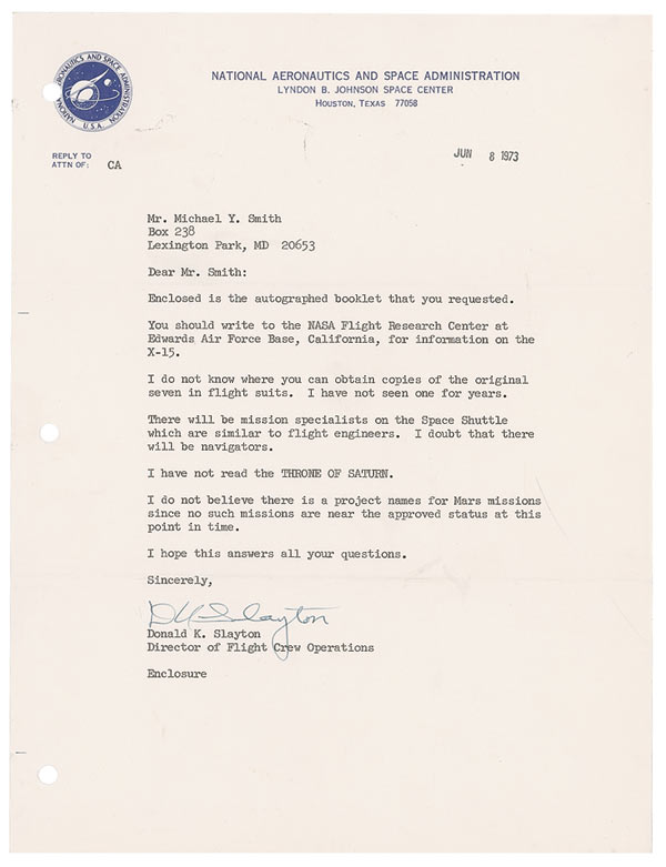 TLS signed “D. K. Slayton,” one page, 8 x 10.5, NASA letterhead, stamp dated June 8, 1973. Letter to a space enthusiast. In part: “I do not know where you can obtain copies of the original seven in flight suits. I have not seen one for years. There will be mission specialists on the Space Shuttle which are similar to flight engineers. I doubt that there will be navigators…I do not believe there is a project names for Mars missions since no such missions are near the approved status at this point in time.” In fine condition, with punch holes to left edge.