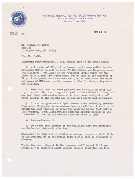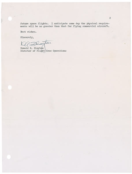 TLS signed “D. K. Slayton,” two pages, 8 x 10.5, NASA letterhead, stamp dated April 25, 1973. Letter to a collector and enthusiast. In part: “Dave Scott has not been grounded and is still actively flying aircraft…I have not gone on a flight because I was medically grounded from space flight due to an unknown heart condition. I was cleared within the last year and am presently assigned to the Apollo/Soyuz test program…Regarding your interest in getting an autopen signature of Ed White or Gus Grissom, we do not retain those plates once an astronaut is deceased.” In fine condition, with punch holes along left edge, and staple holes to top left.