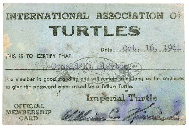 Deke Slayton’s personal International Association of Turtles membership card, 3.25 x 2.25, issued on October 16, 1961. The notorious Turtles Club was a drinking club in which Wally Schirra held the title of a Grand Potentate. Slayton’s membership in the Turtles came up during Apollo 7, which was captured by the in-flight recorder. Reverse bears the printed instructions in giving the password for the club when asked, as well as the resulting penalty if unsuccessful: “you forfeit a beverage of his choice.” In very good condition, with card having been laminated, scattered wear, soiling, and toning, and surface loss to reverse.