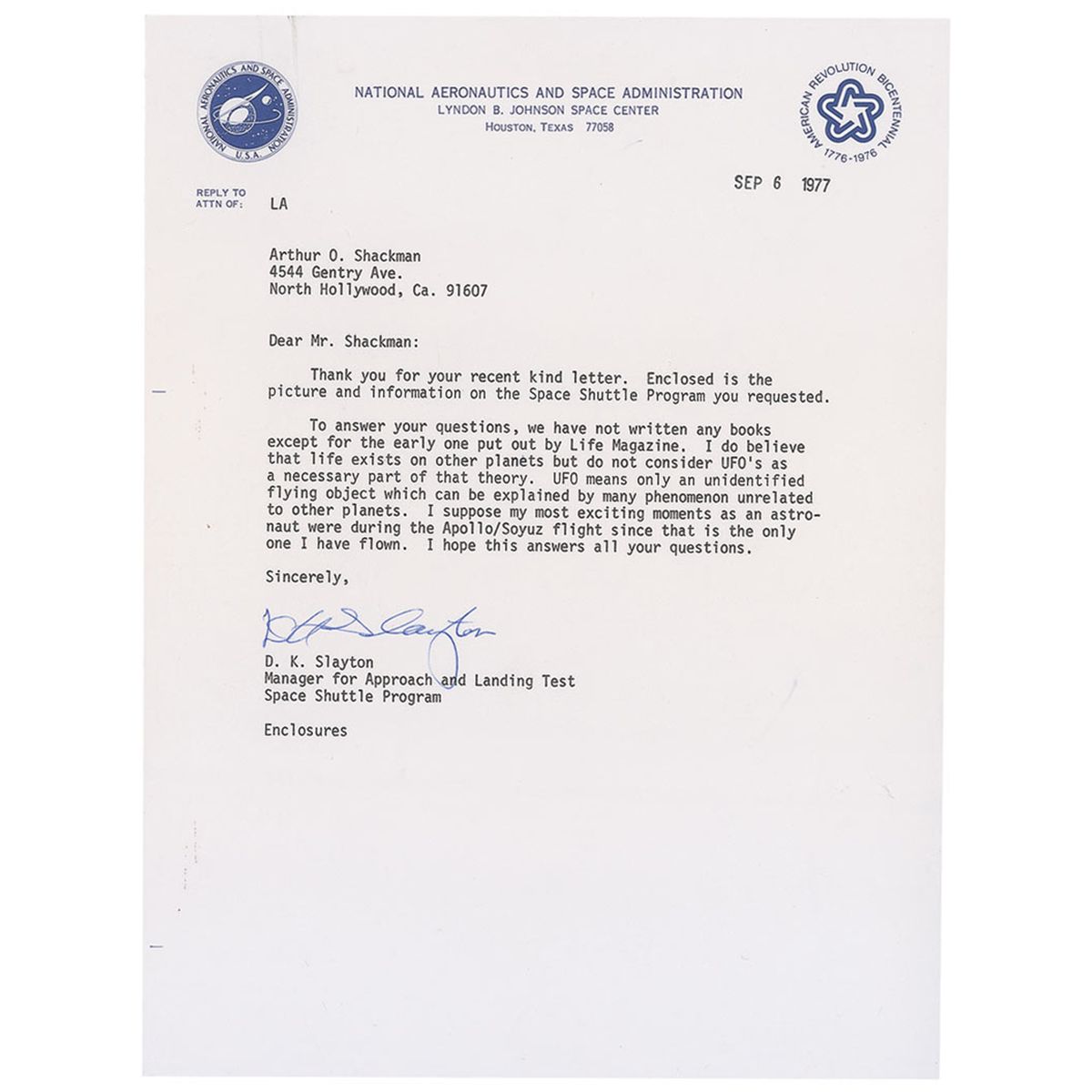 TLS signed “D. K. Slayton,” one page, 8 x 10.5, NASA letterhead, September 6, 1977. Letter to a space enthusiast. In part: “We have not written any books except for the early one put out by Life magazine. I do believe that life exists on other planets but do not consider UFO’s as a necessary part of that theory. UFO means only an unidentified flying object which can be explained by many phenomenon unrelated to other planets. I suppose my most exciting moments as an astronaut were during the Apollo/Soyuz flight since it is the only one I have flown.” In fine condition, with a paperclip impression to top edge. Intriguing content, as not many astronauts are willing to share their theories on extraterrestrials.