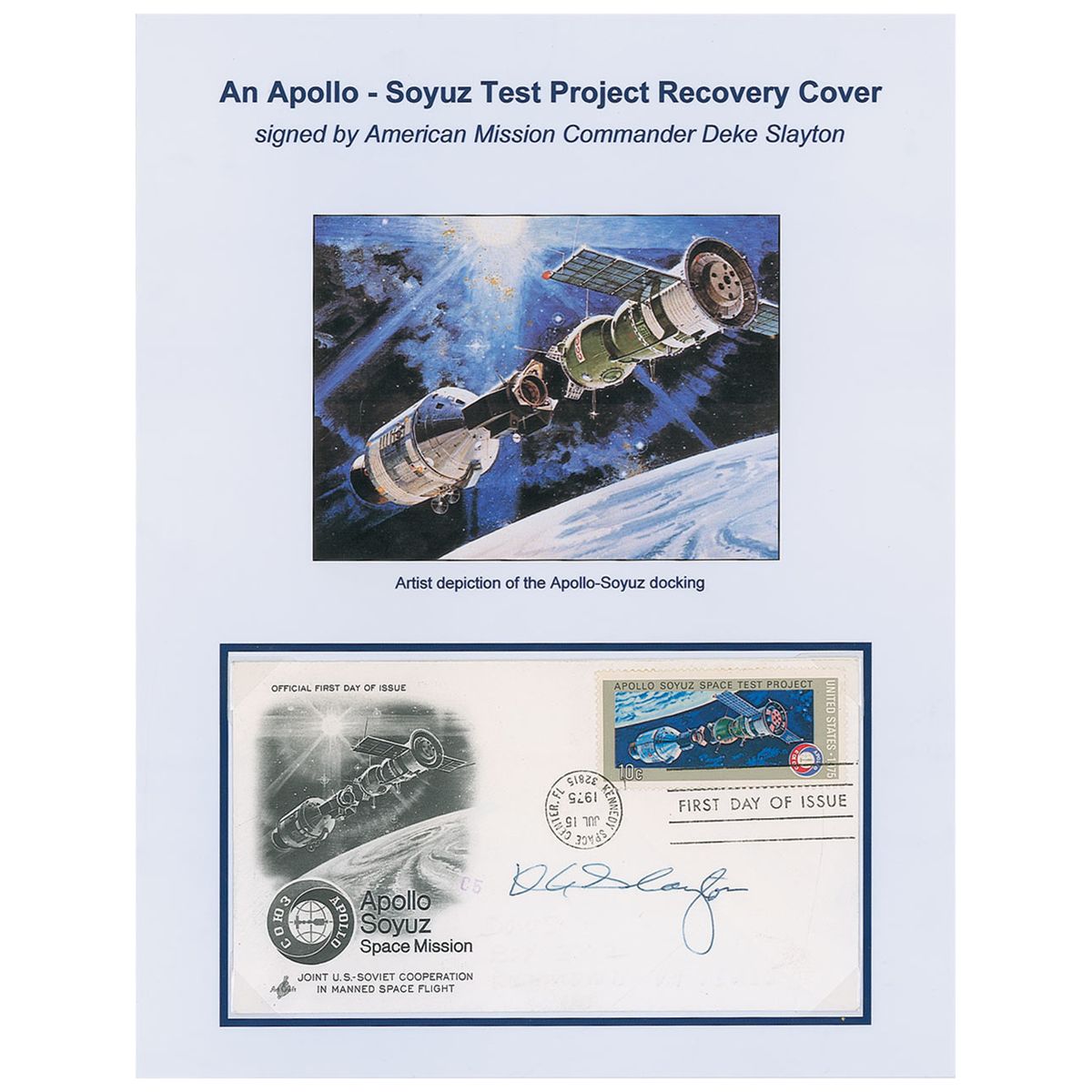 Apollo/Soyuz test project recovery cover with a cachet honoring the Apollo/Soyuz mission, signed on the front in blue ink by Slayton. Removably presented on a color 8.5 x 11 informational sheet. In fine condition.