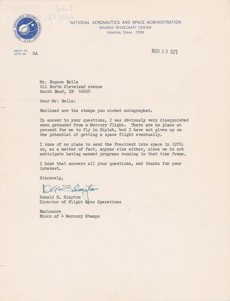 TLS signed “D. K. Slayton,” one page, 8 x 10.5, NASA letterhead, March 29, 1971. Letter to an admirer. In part: “I was obviously very disappointed when grounded from the Mercury flight. There are no plans at present for me to fly in Skylab, but I have not given up on the potential of getting a space flight eventually. I know of no plans to send the President into space in 1976; or, as a matter of fact, anyone else either, since we do not anticipate having manned programs running in that time frame.” In fine condition, with a trivial spot of soiling to the upper left, some show-through from a notation to the reverse, and slight haloing to the signature.