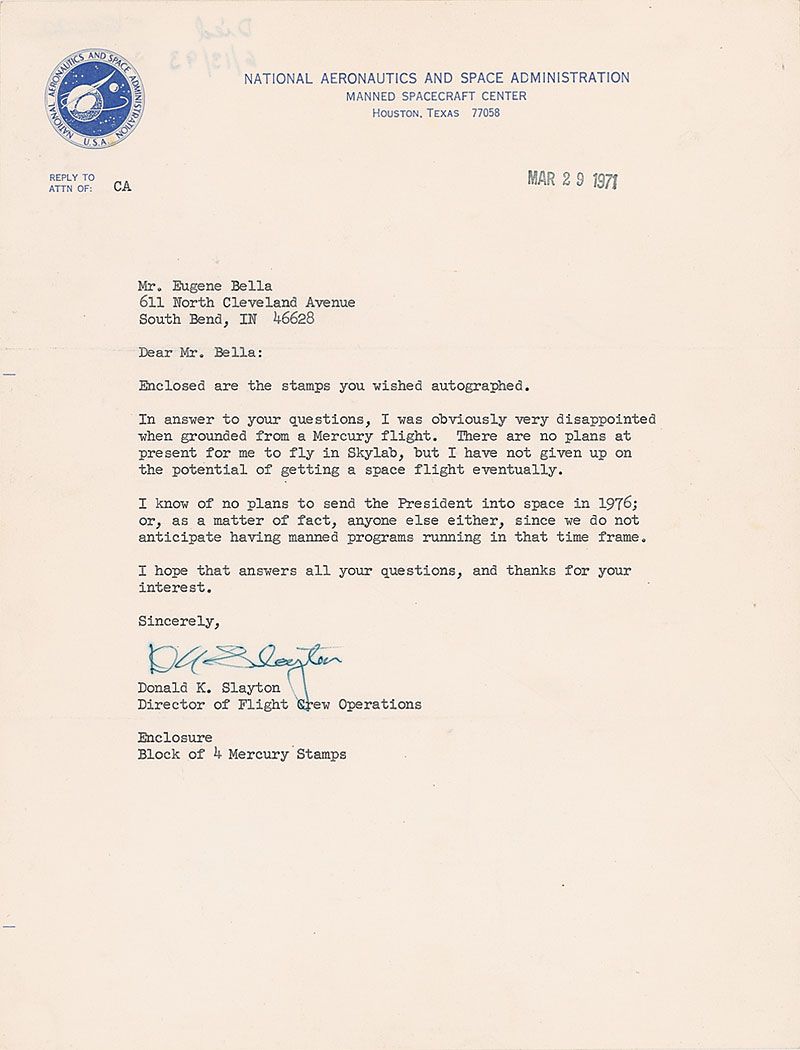 TLS signed “D. K. Slayton,” one page, 8 x 10.5, NASA letterhead, March 29, 1971. Letter to an admirer. In part: “I was obviously very disappointed when grounded from the Mercury flight. There are no plans at present for me to fly in Skylab, but I have not given up on the potential of getting a space flight eventually. I know of no plans to send the President into space in 1976; or, as a matter of fact, anyone else either, since we do not anticipate having manned programs running in that time frame.” In fine condition, with a trivial spot of soiling to the upper left, some show-through from a notation to the reverse, and slight haloing to the signature.