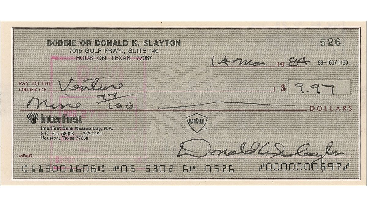 Personal check, 6 x 2.75, filled out and signed by Slayton, “Donald K. Slayton,” payable to Venture for $9.97, March 14, 1984. In fine condition, with a light bank stamp to left side.