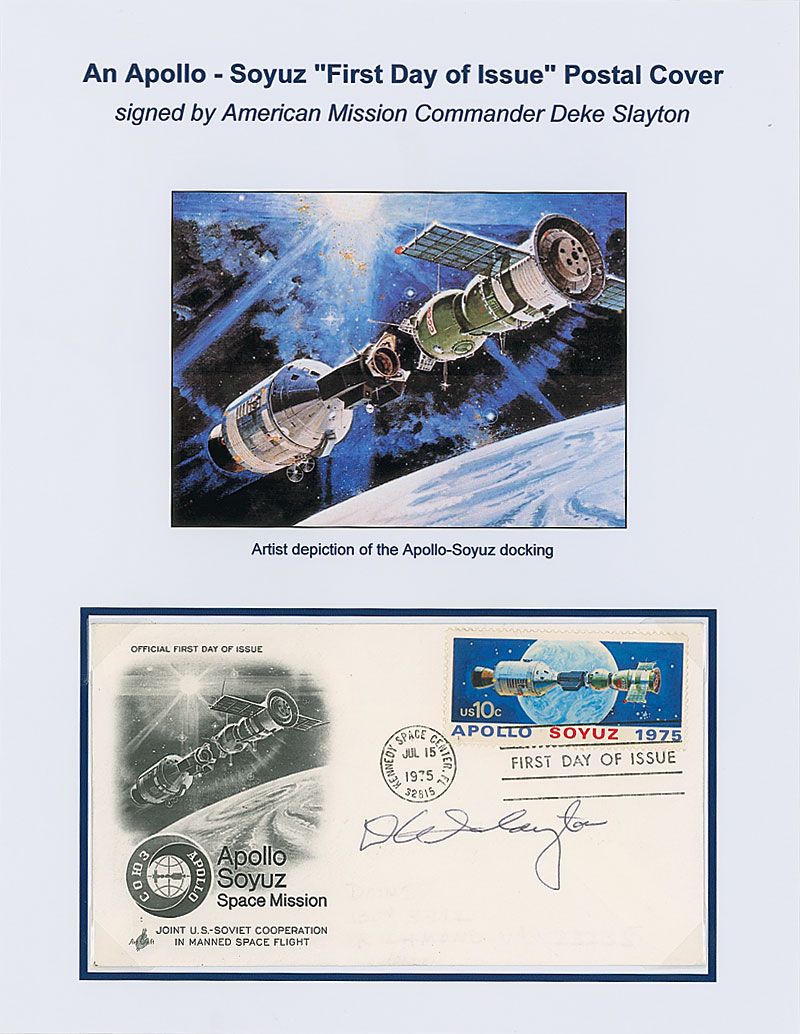 FDC with a cachet honoring the Apollo-Soyuz Space Mission, signed in black ballpoint by Slayton. Removably presented on a color 8.5 x 11 informational sheet. In fine condition, with some faint pencil remnants to bottom portion.
