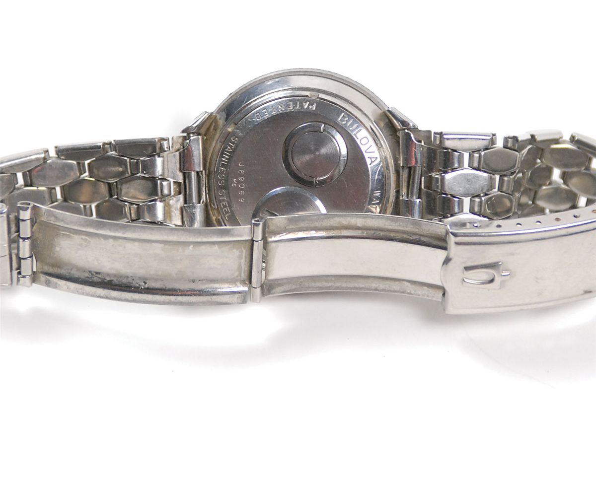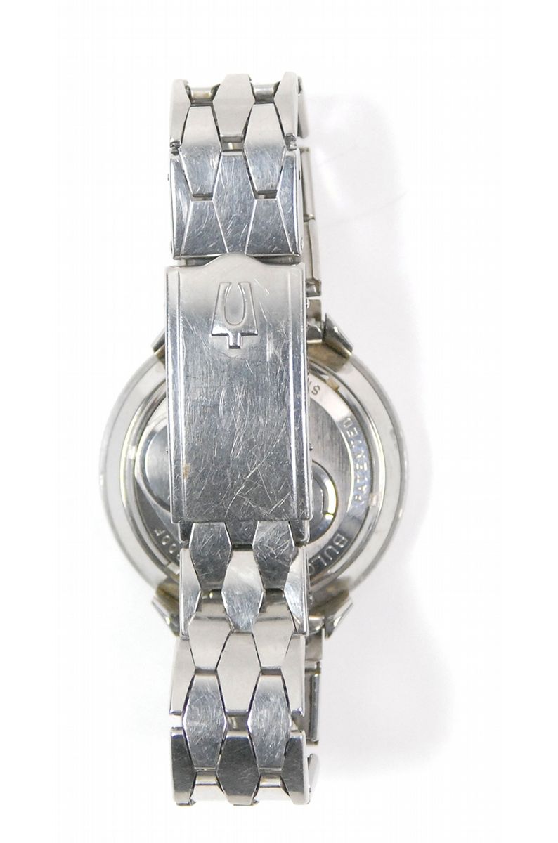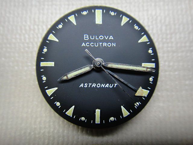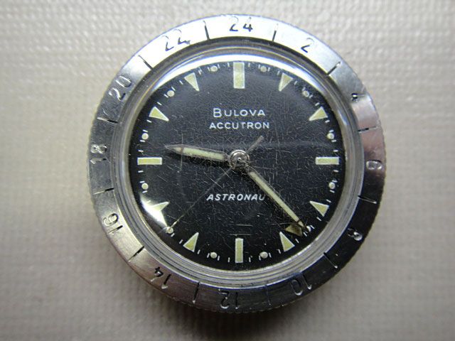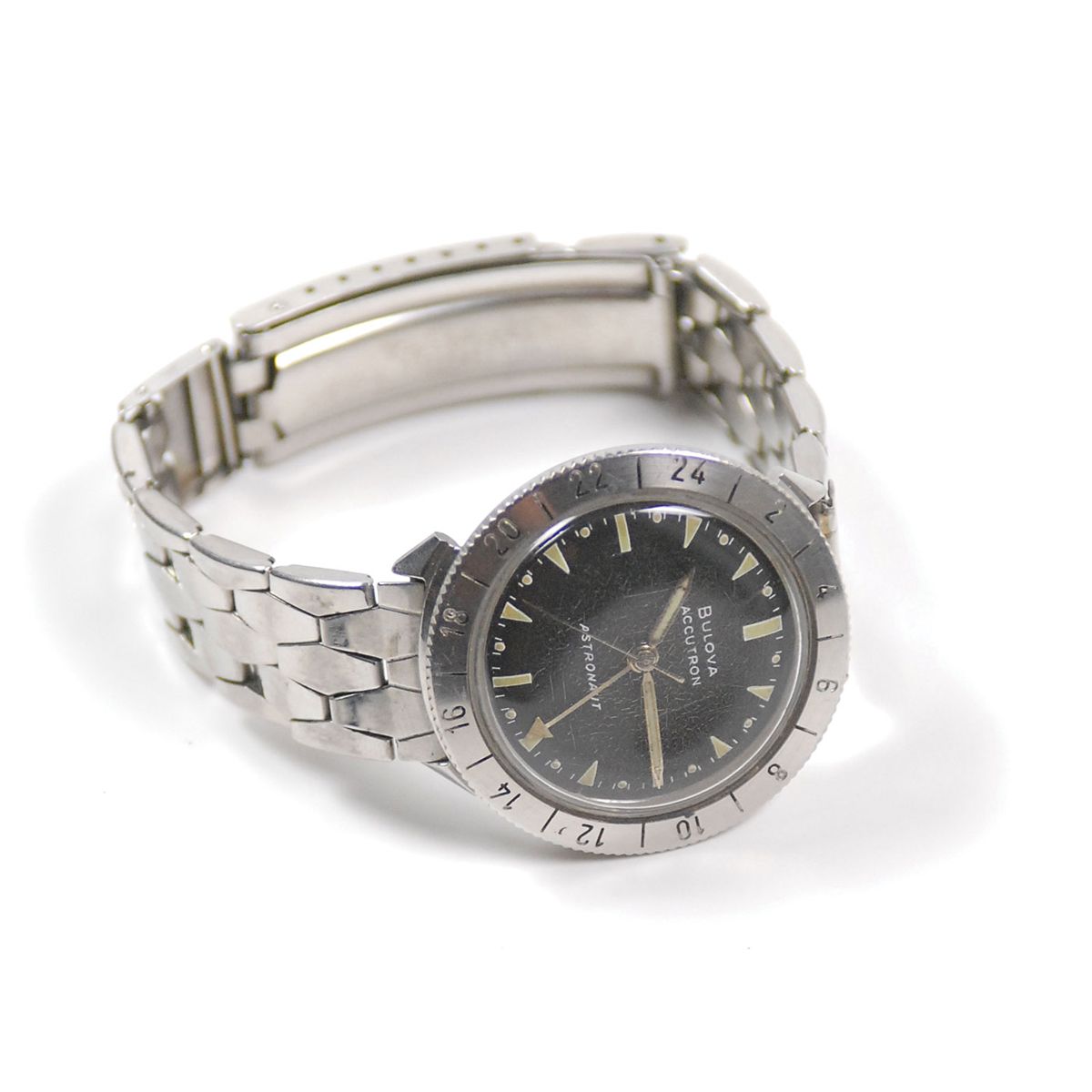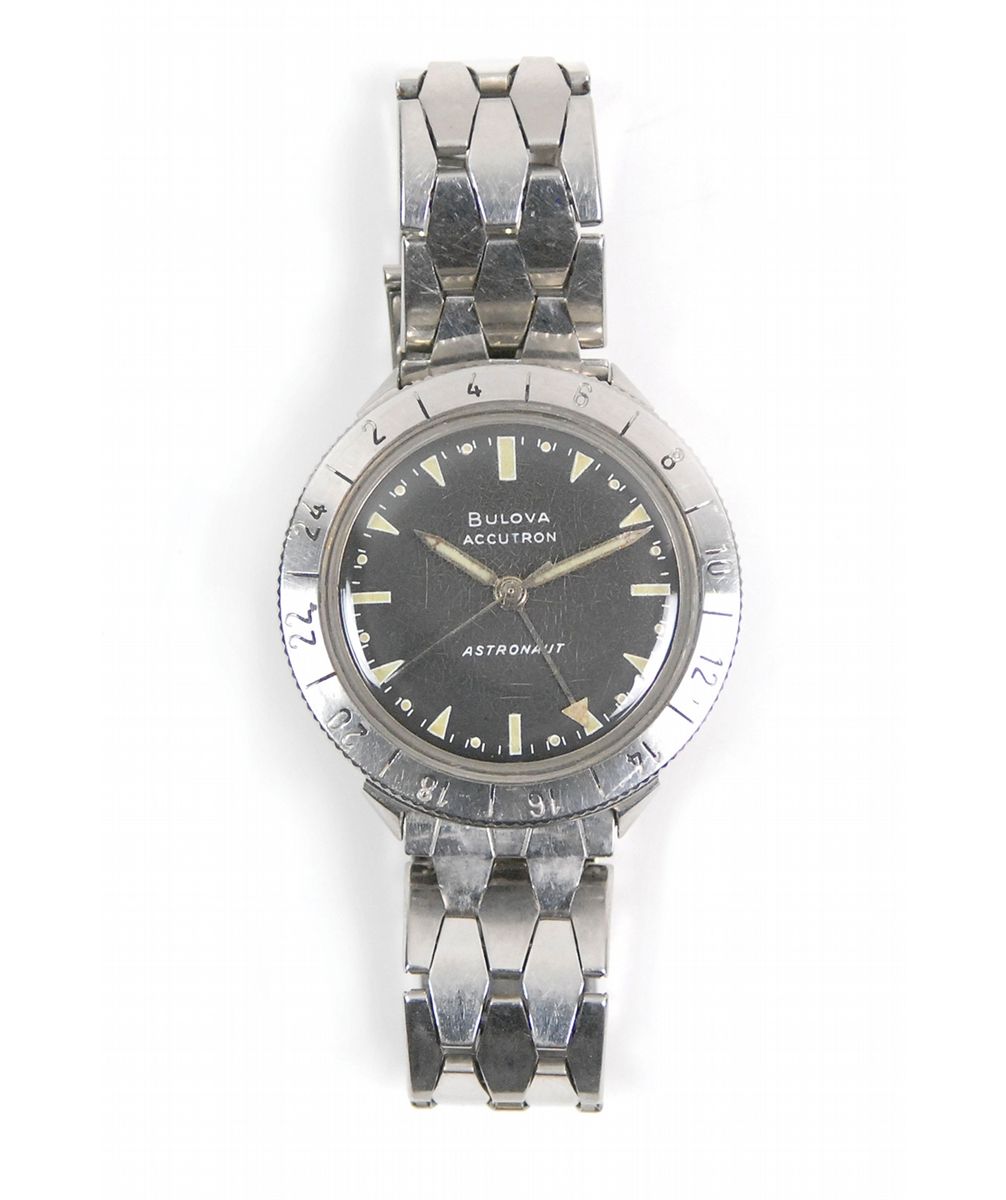 Deke Slayton's personally-owned and -worn Bulova Accutron Astronaut model wristwatch in stainless steel with original stainless steel Bulova Accutron bracelet, grade 214 tuning-fork mechanism, black 12-hour dial with 24-hour rotating bezel, additional hand with arrow pointer indicating time on the 24-hour scale, with luminous hands and markers. The bezel allows one to read local time in the 24-hour system when the "24" indication on the bezel is opposite the 12 o'clock marker on the dial, and also allows one to set the bezel in position for another time zone anywhere on the planet. The movement, case, dial, crown and band are all ‘signed’ or bear the Accutron logo. Originally, the batteries for such watches were 1.35V mercury, while today watch batteries are 1.55V; the difference in voltage would yield slightly different timekeeping requiring regulation if changed to modern batteries.