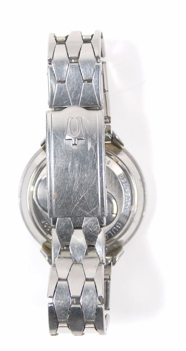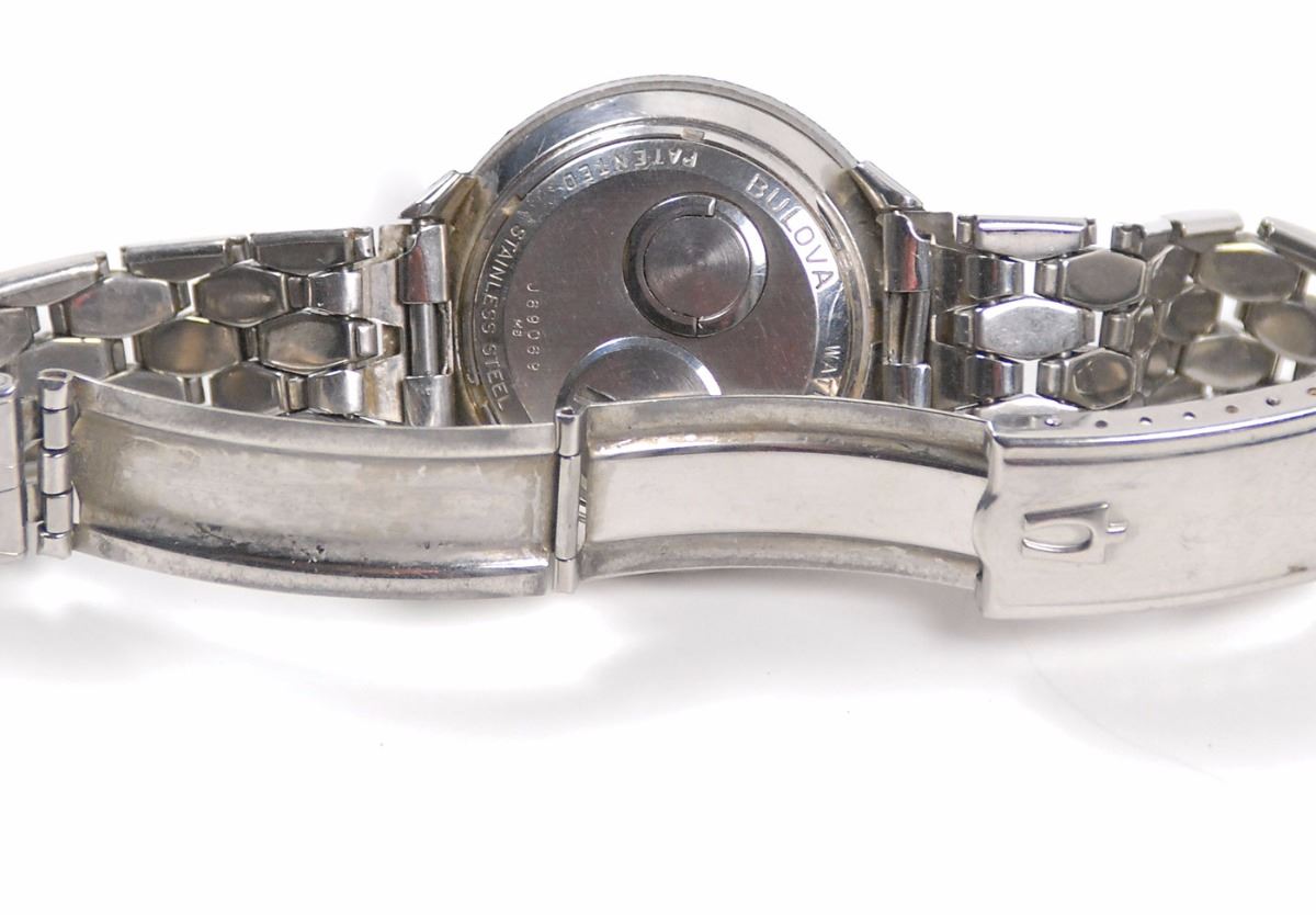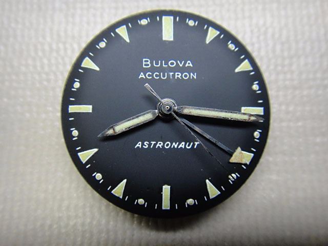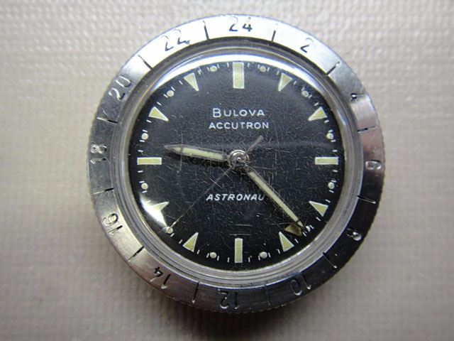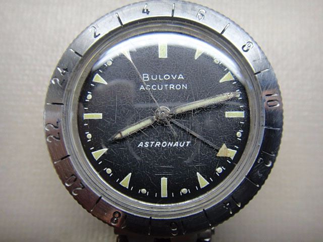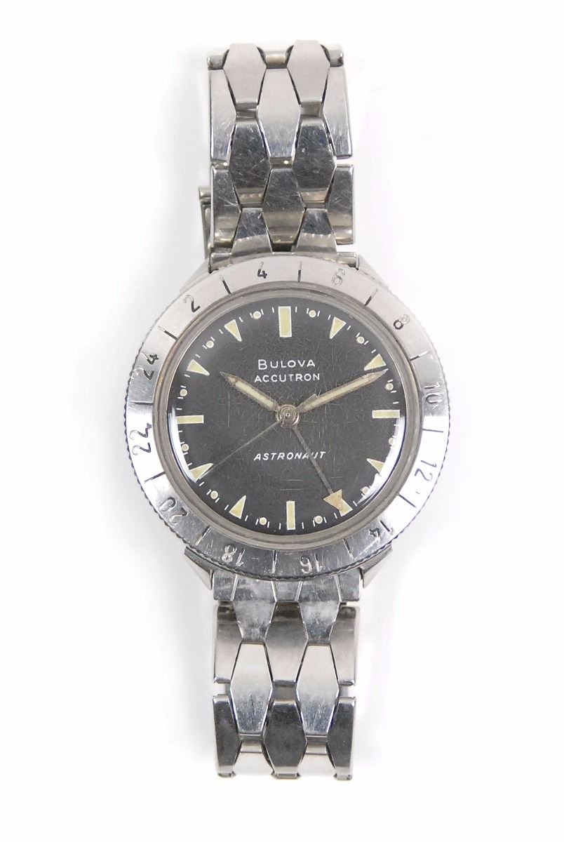 Deke Slayton's personally-owned and -worn Bulova Accutron Astronaut model wristwatch in stainless steel with original stainless steel Bulova Accutron bracelet, grade 214 tuning-fork mechanism, black 12-hour dial with 24-hour rotating bezel, additional hand with arrow pointer indicating time on the 24-hour scale, with luminous hands and markers. The bezel allows one to read local time in the 24-hour system when the "24" indication on the bezel is opposite the 12 o'clock marker on the dial, and also allows one to set the bezel in position for another time zone anywhere on the planet. The movement, case, dial, crown and band all bear the Accutron logo. Originally, the batteries for such watches were 1.35V mercury, while today watch batteries are 1.55V; the difference in voltage would yield slightly different timekeeping requiring regulation if changed to modern batteries.