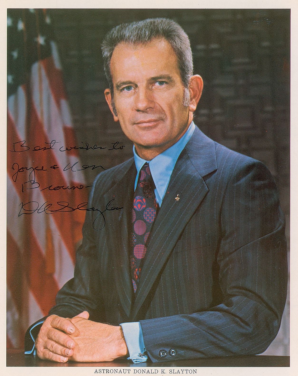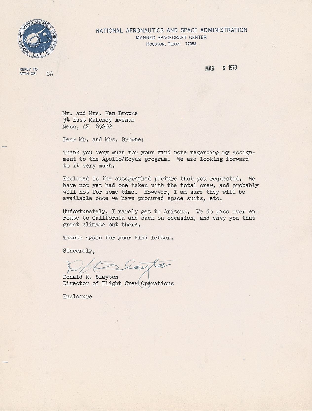 Two items: a TLS signed "D. K. Slayton," one page, 8 x 10.5, NASA letterhead, March 6, 1973, addressed to Mr. and Mrs. Ken Browne, in part: "Thank you very much for your kind note regarding my assignment to the Apollo/Soyuz program. We are looking forward to it very much. Enclosed is the autographed picture that you requested. We have not yet had one taken with the total crew, and probably will not for some time. However, I am sure they will be available once we have procured space suits, etc."; and an official color 8 x 10 NASA lithograph of Deke Slayton in a formal pose with the American flag visible in the background, signed and inscribed in black ink, "Best wishes to Joyce & Ken Browne—D. K. Slayton." In overall fine condition.