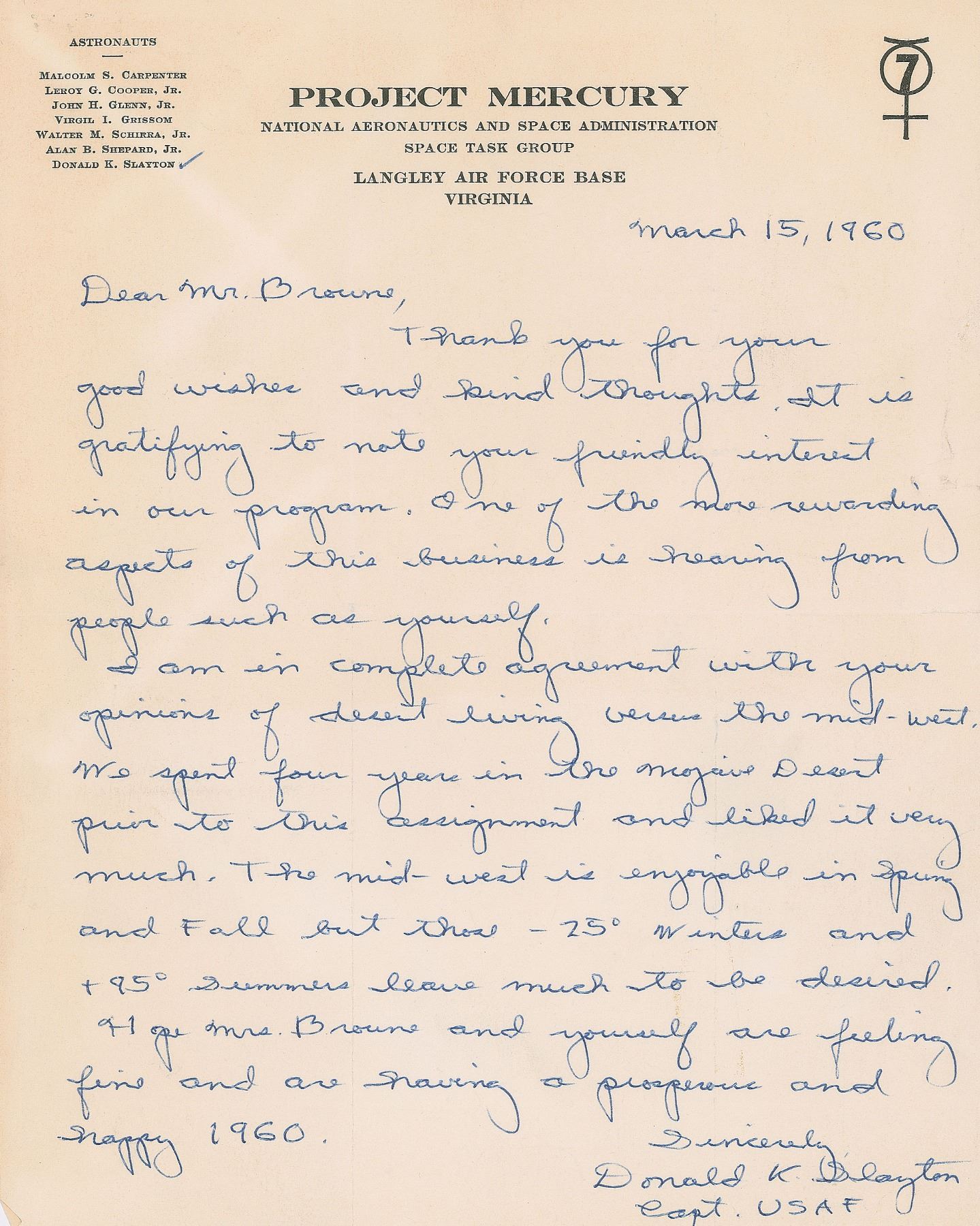 ALS signed “Donald K. Slayton, Capt. USAF,” one page, 8 x 10, Project Mercury letterhead, March 15, 1960. Letter to Ken Browne, in part: "Thank you for your good wishes and kind thoughts. It is gratifying to note your friendly interest in our program. One of the more rewarding aspects of this business is hearing from people such as yourself. I am in complete agreement with your opinions of desert living versus the mid-west. We spent four years in the Mojave Desert prior to this assignment and liked it very much. The mid-west is enjoyable in Spring and Fall but the those –25 winters and +95 summers leave much to be desired." In very good to fine condition, with staple holes to the upper left corner, and some faint toning. Accompanied by the original mailing envelope, addressed in Slayton's own hand.