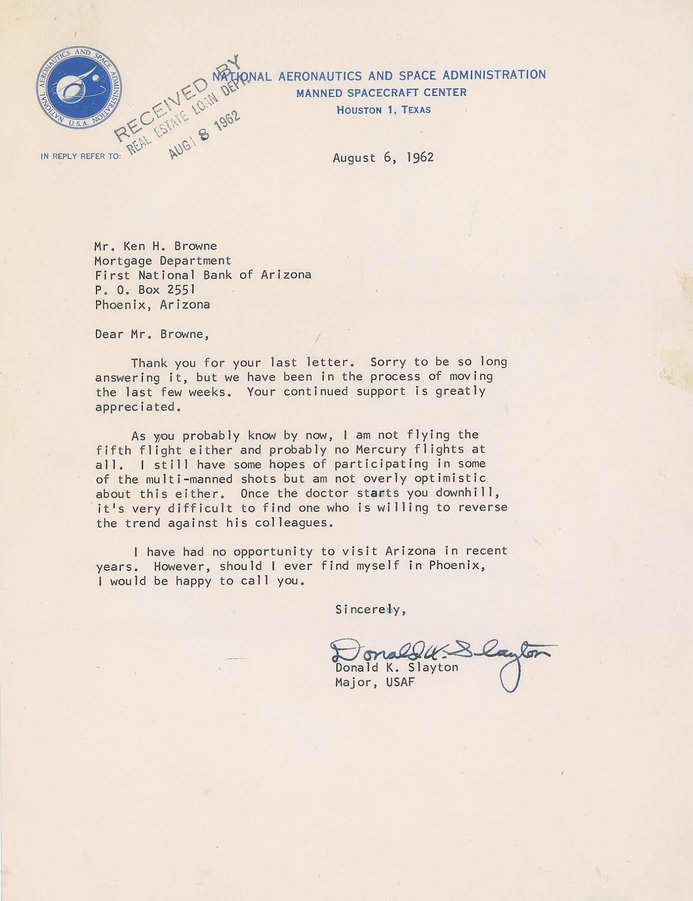 TLS signed “Donald K. Slayton,” one page, 8 x 10.5, NASA letterhead, August 6, 1962. Letter to Ken Browne, in part: "As you probably know by now, I am not flying the fifth flight either and probably no Mercury flights at all. I still have some hopes of participating in some of the multi-manned shots but am not overly optimistic about this either. Once the doctor starts you downhill, it's very difficult to find one who is willing to reverse the trend against his colleagues." In fine condition, with staple holes to the upper left corner. Accompanied by the original mailing envelope.