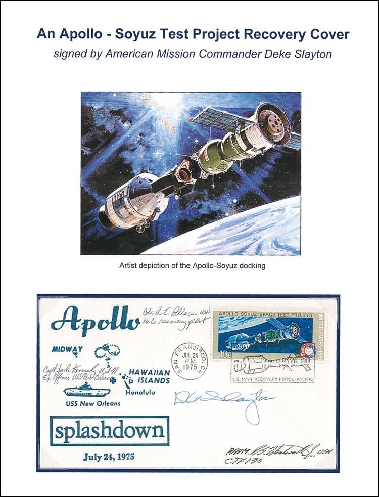 Apollo-Soyuz recovery postal cover with a cachet honoring the splashdown, signed on the front in blue ink by Deke Slayton, and also signed by three recovery officials. Removably presented on a color 8.5 x 11 informational sheet. In very fine condition. Pre-certified Scott Cornish and RRAuction COA.