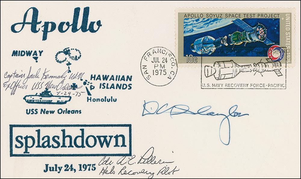 Apollo-Soyuz recovery postal cover with a cachet honoring the mission’s splashdown, signed on the front in blue ink by Slayton as well as two members of the recovery force. In fine condition. Pre-certified Scott Cornish and RRAuction COA.
