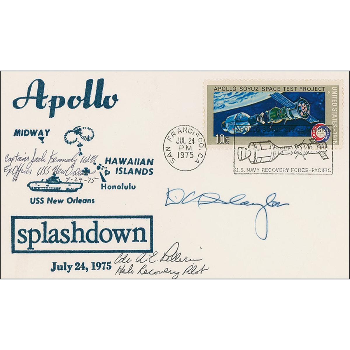Apollo-Soyuz recovery postal cover with a cachet honoring the mission’s splashdown, signed on the front in blue ink by Slayton as well as two members of the recovery force. In fine condition.
