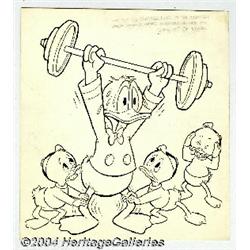 <B>Del Connell (attributed) - Walt Disney's Comics and Stories #294 Cover Original Art (Gold Key, 1965).</B></I> Donald Duck is pumping iron and the Nephews are helping him stay hungry... but for how long? A nifty image in the Barks tradition, this would make a fine addition to any Duck collection. The art measures 10.75" x 11.75" (the cut at the top is slightly irregular) and in Excellent condition. A VG copy of the printed comic is also included. 2 items <BR><BR><B>Important notice:</B> Heritage usually auctions material at the rate of 200-250 lots per hour. On some occasions eBay Live bid software or the Internet may not be able to keep up with the pace of the auction. We recommend placing a realistic absentee bid now as insurance to avoid disappointment. Occasionally the auctioneer may eliminate or reject an eBay Live bid, and the auctioneer may also reopen a lot after the close of the eBay live bidding (usually because we missed an audience bid), and may reject your bid even if it shows you as the winning bidder. By bidding via eBay Live, you agree that Heritage may award the lot to another bidder at its sole discretion under the circumstances described above or any other reasonable circumstances. Since eBay bids are not shown to us until we open the lot on the floor, we treat those bids just like floor bids. In most cases the floor responds before the eBay bid is presented to us, due to Internet lag time, so for consistency we have made it a policy that floor bids are always considered first over tie eBay live bids. Also please note that all Heritage lots purchased through eBay Live carry a 20% Buyer's Premium. Please make sure you read the Terms and Conditions before you bid.