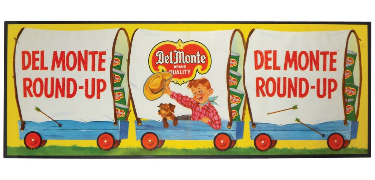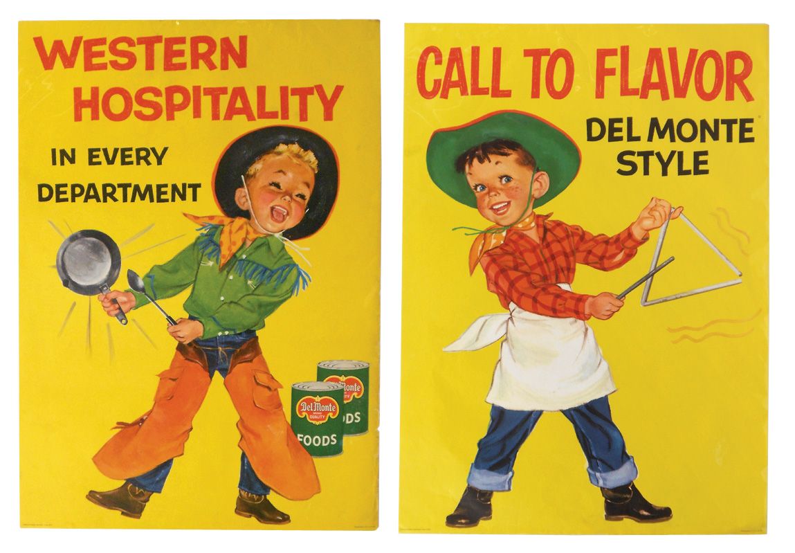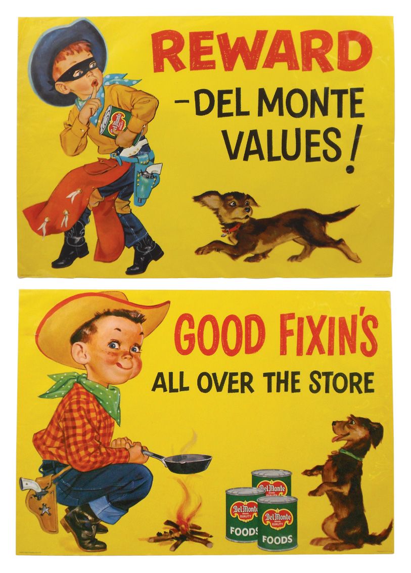 Del Monte Foods paper signs, 1950's 5-panel advertising "Round-Up" display, colorful cute cowboy lit