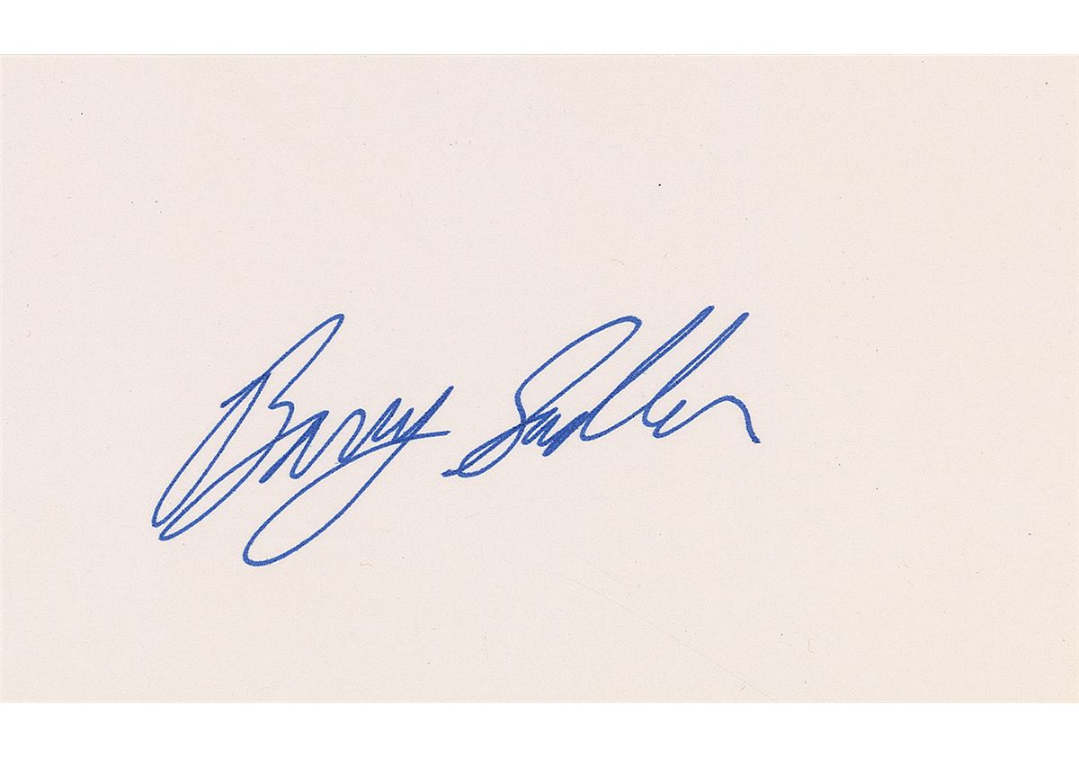 Two items: a blue felt tip signature, “Del Shannon,” on an off-white 5 x 3 clipped card; and a blue ink signature, “Barry Sadler,” on a white 5 x 3 card. In overall fine condition.