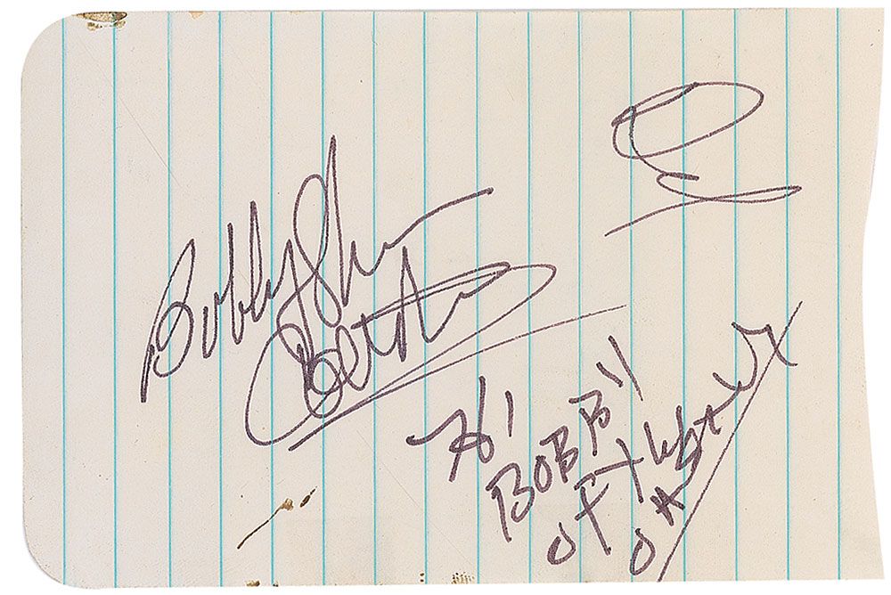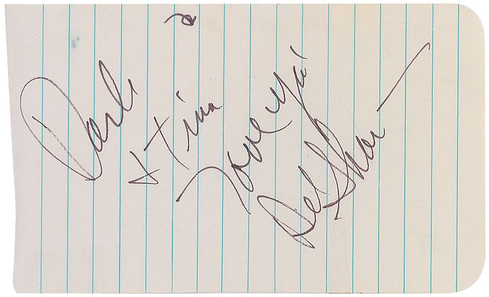 Vintage felt tip signature and inscription, “Darla & Tina, Love ya! Del Shannon,” on an off-white 4.5 x 2.75 lightly-lined sheet. In fine condition. Accompanied by a similar size sheet, signed in felt tip, “Del,” and also signed by two others.