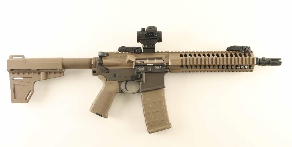 Pistol. Semi-Automatic. Del-Ton DTI-15 lower, and LWRC piston M6A2 upper. BTE Trigger. 11" barrel, with flash suppressor. 4 rail steel hand guards. Magpul MGUS adjustable flip sights attached. Magpul MOE pistol grip..Shockwave adjustable stock. Thumb extension on mag release. BTE charging handle. Mounted with a Bushnell TRS25 red-dot reflex sight. Ejection port cover has the American, Arizona, "Infidel", and Army star on it. 30" overall. One 30-rd Magpul magazine. Tan desert color painted finish, except for the anodized green lower. Bore appears excellent/bright. Action is crisp/tight. Metal finish furniture is very good with some minor scratches, edge wear. NRA Condition-Very Good. Modern Firearm