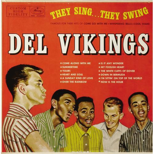 <B>Del Vikings "They Sing... They Swing" Mono LP Mercury 20314 (1957).</B></I> The group's first album for Mercury was their second overall, following an earlier release on Luniverse. Strangely enough, although their biggest hits, "Come Go With Me" and "Whispering Bells" were released on Dot, that label didn't release an album until 1966. The colorful, predominantly red cover looks terrific on this copy. The back cover has a small "76" neatly stamped at the top left. The record is Mint. Condition: NM 8/ MT 9. <I>From the GRT Collection</B></I>
