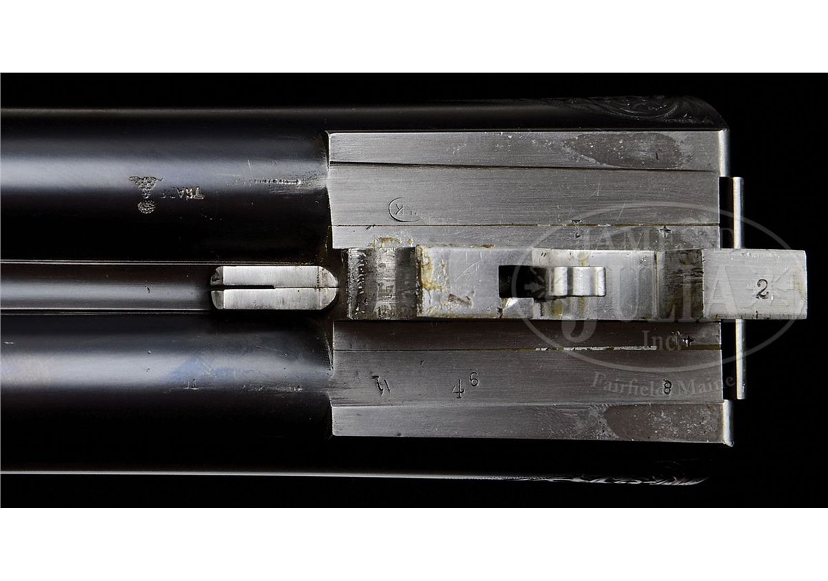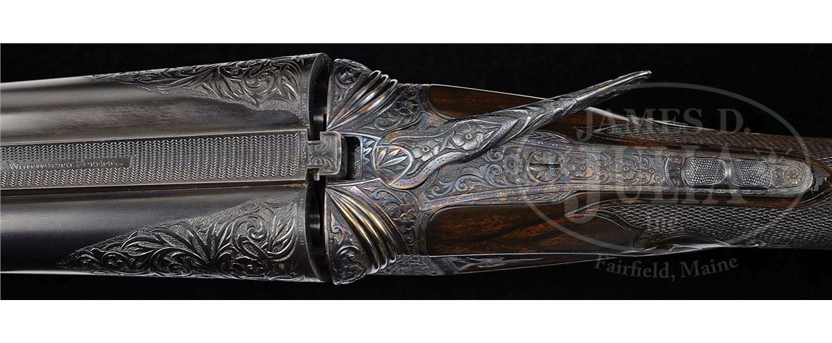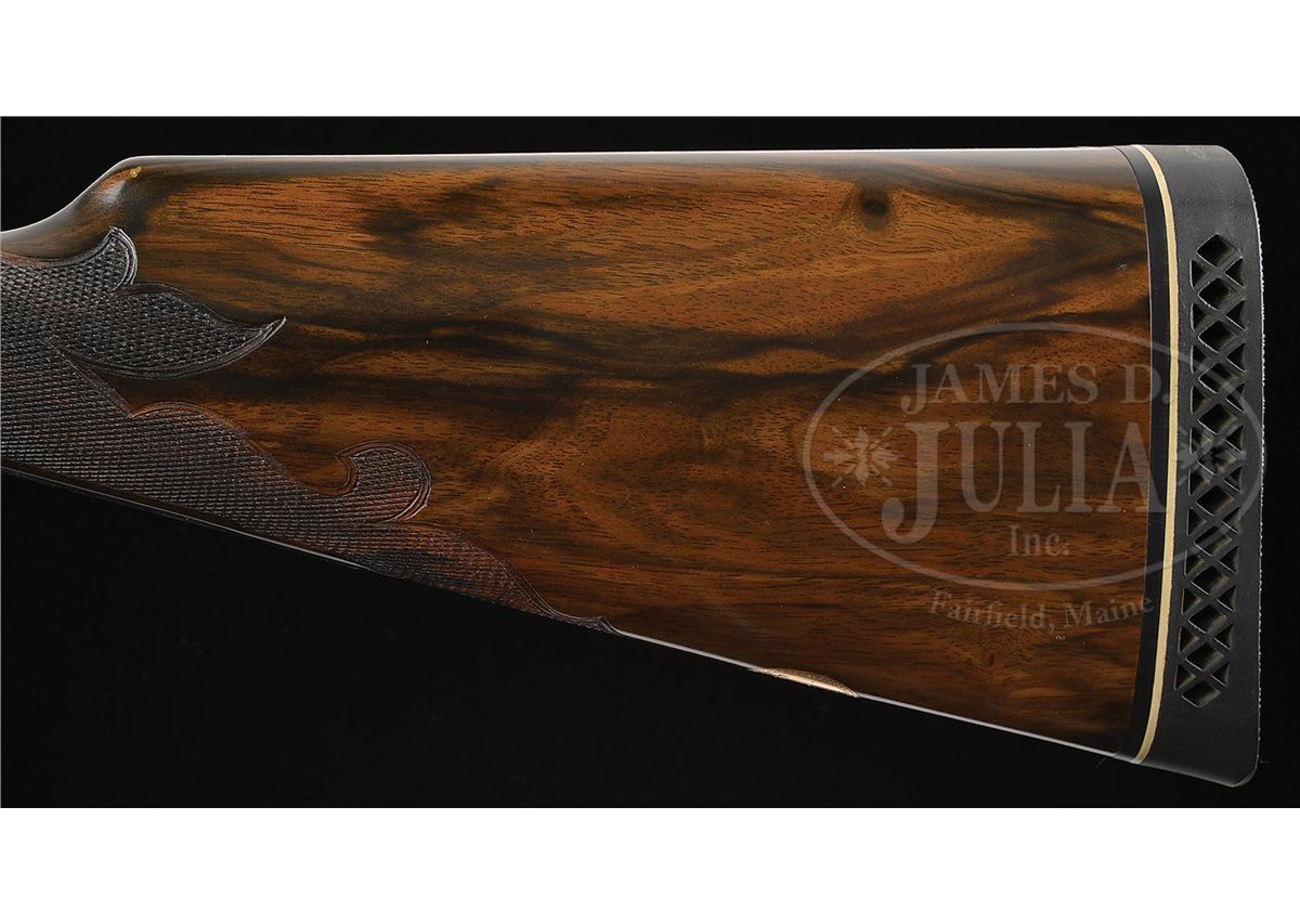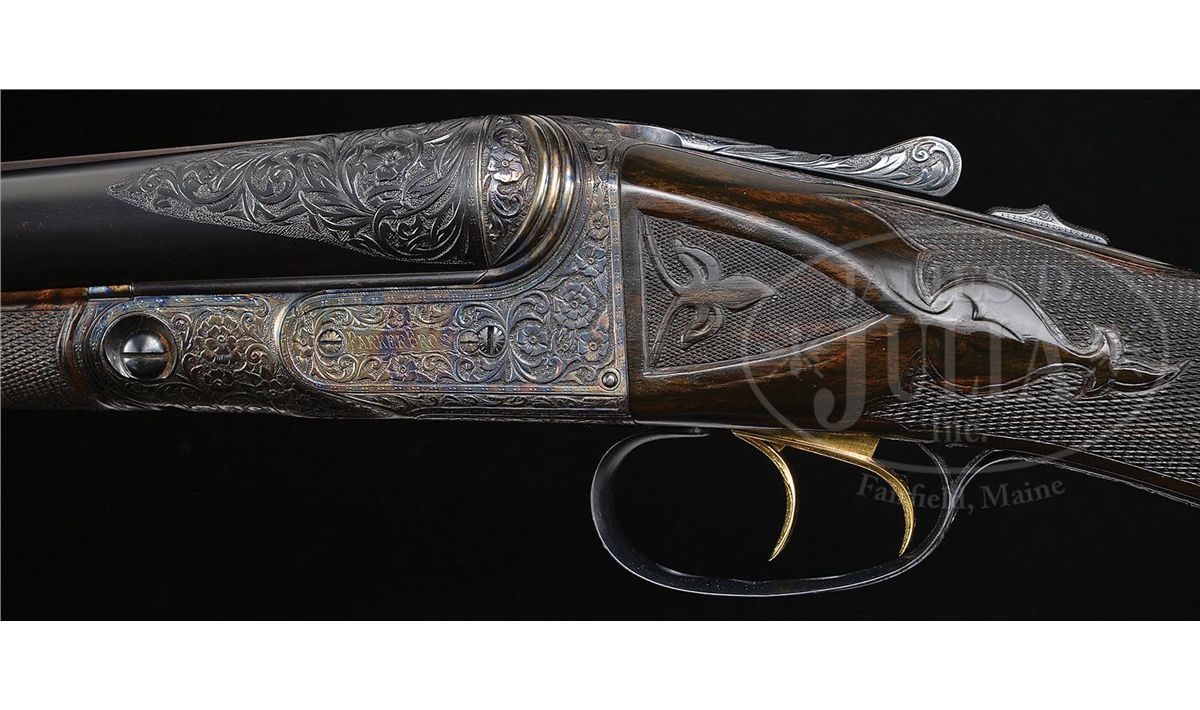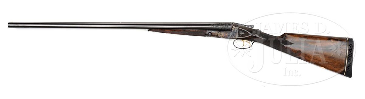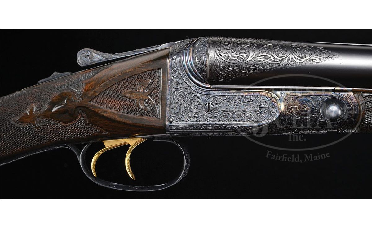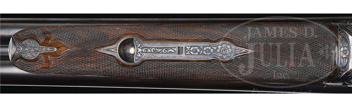 SN 135772. Cal. 12 ga. 2-3/4" Chambers. No. 2 Frame. 30" Bbls are engraved "No 1 Special. Parker Bros. Makers. Meriden. Conn. Whitworth Steel" on rib, which is mounted with two ivory beads. There are 2-7/8" triangles of large, shaded acanthus scroll with floral highlights at breech ends of bbls, and small, geometric band around muzzles. Bbl flats have correct markings, left bbl with partial sheaf of wheat trademark. Water table is marked "8", SN, "A" on left side, and with usual patents, etc. on right. Cyanide colored action features automatic safety, engraved and checkered gold-plated triggers, and three beads around rear portion of fences. Trigger guard bow is pierced. Metal parts are engraved with semi-relief, large, open, scrolled acanthus with floral highlights and bouquets. Trigger plate has almost all floral engraving, and a large rose is on bottom of action. Engraving on fences is in higher relief. "Parker Bros" is on each side of action. SN is in high relief at grip. Finely marbled and lightly figured European walnut straight grip buttstock measures 14-5/8" over "Larry DelGrego" marked open-sided, white line, black pad. Stock features fine checkering on side panels pierced with fleur-di-lis and ribbons, fleur-di-lis drop points, and A 1 Special style fancy fleur-di-lis checkering with mullered borders. A gold oval on toe line is engraved "C. H. T. JR." Matching splinter ejector forend has nicely filed tip, and near full coverage of checkering. Bore diameter: left-.733, right -.732. Bore restrictions: left -.039 (Full), right -.037 (Full). Wall thickness: left -.023, right -.027. Drop at heel: 2", drop at comb: 1-5/16". Weight: 8 lbs. 1 oz. LOP: 14-5/8". CONDITION: Excellent, as restored, retaining essentially all of their new finishes on wood and metal. There are some slight chips behind top tang of action. Bores are excellent. Action is tight. Ejectors are in time. This fine gun conforms to all specifications as set forth in Parker Gun Identification and Serialization ledger, with the exception that it is listed as a "capped pistol grip". Inspection of orig SNs on stock and trigger guard show no evidence that this was other than a straight grip gun. Remnants of spur from either an old Silver pad, or hard rubber buttplate, is at heel in front of pad. Factory records indicate the gun was restocked twice, the first two stocks on this gun were capped pistol grip, the third, a straight grip. 4-49590 MGM123