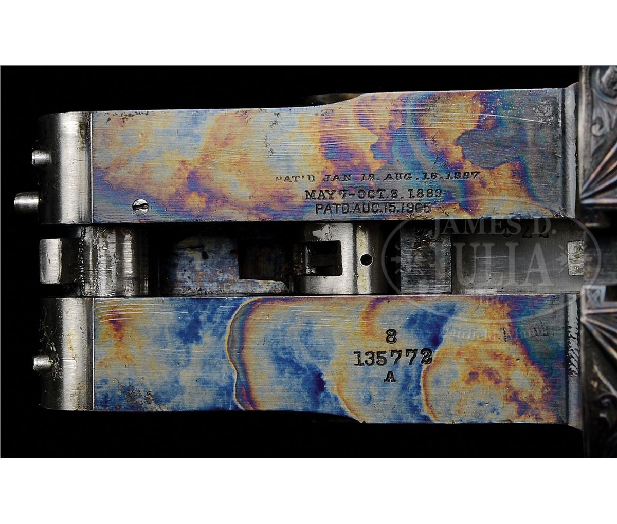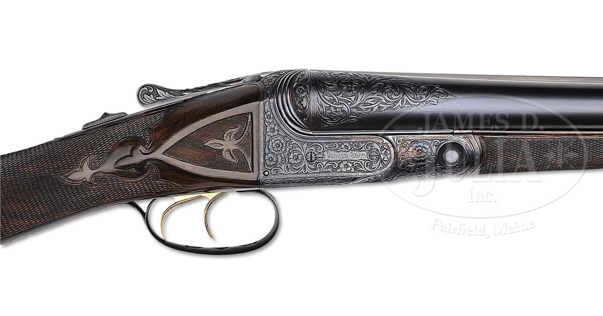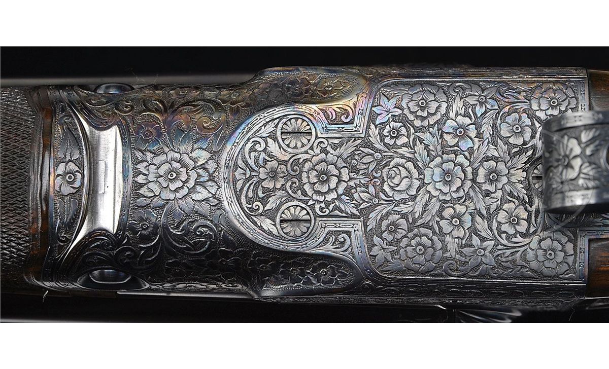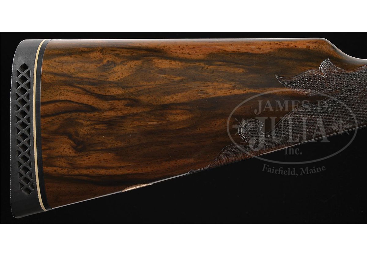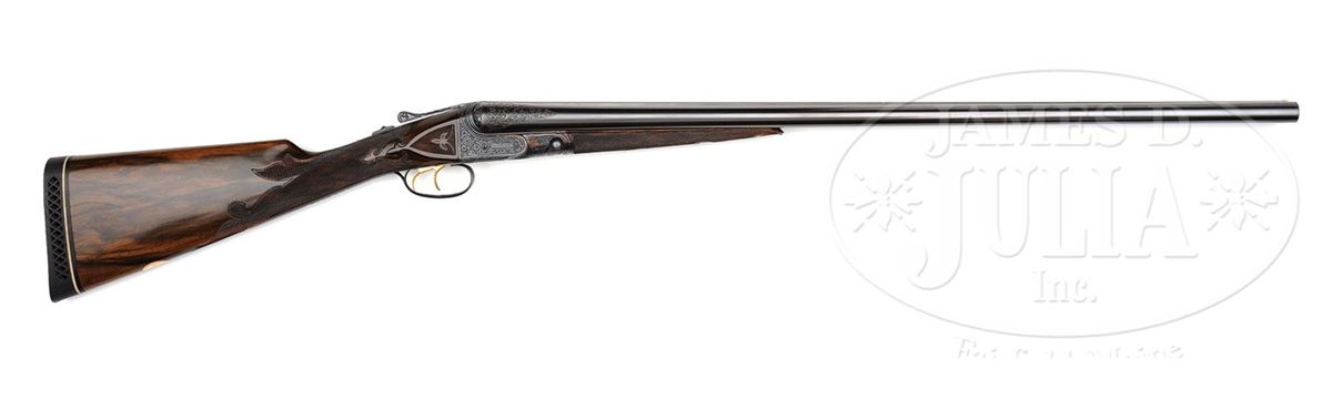 SN 135772. Cal. 12 ga. 2-3/4" Chambers. No. 2 Frame. 30" Bbls are engraved "No 1 Special. Parker Bros. Makers. Meriden. Conn. Whitworth Steel" on rib, which is mounted with two ivory beads. There are 2-7/8" triangles of large, shaded acanthus scroll with floral highlights at breech ends of bbls, and small, geometric band around muzzles. Bbl flats have correct markings, left bbl with partial sheaf of wheat trademark. Water table is marked "8", SN, "A" on left side, and with usual patents, etc. on right. Cyanide colored action features automatic safety, engraved and checkered gold-plated triggers, and three beads around rear portion of fences. Trigger guard bow is pierced. Metal parts are engraved with semi-relief, large, open, scrolled acanthus with floral highlights and bouquets. Trigger plate has almost all floral engraving, and a large rose is on bottom of action. Engraving on fences is in higher relief. "Parker Bros" is on each side of action. SN is in high relief at grip. Finely marbled and lightly figured European walnut straight grip buttstock measures 14-5/8" over "Larry DelGrego" marked open-sided, white line, black pad. Stock features fine checkering on side panels pierced with fleur-di-lis and ribbons, fleur-di-lis drop points, and A 1 Special style fancy fleur-di-lis checkering with mullered borders. A gold oval on toe line is engraved "C. H. T. JR." Matching splinter ejector forend has nicely filed tip, and near full coverage of checkering. Bore diameter: left-.733, right -.732. Bore restrictions: left -.039 (Full), right -.037 (Full). Wall thickness: left -.023, right -.027. Drop at heel: 2", drop at comb: 1-5/16". Weight: 8 lbs. 1 oz. LOP: 14-5/8". CONDITION: Excellent, as restored, retaining essentially all of their new finishes on wood and metal. There are some slight chips behind top tang of action. Bores are excellent. Action is tight. Ejectors are in time. This fine gun conforms to all specifications as set forth in Parker Gun Identification and Serialization ledger, with the exception that it is listed as a "capped pistol grip". Inspection of orig SNs on stock and trigger guard show no evidence that this was other than a straight grip gun. Remnants of spur from either an old Silver pad, or hard rubber buttplate, is at heel in front of pad. Factory records indicate the gun was restocked twice, the first two stocks on this gun were capped pistol grip, the third, a straight grip. 4-49590 MGM123