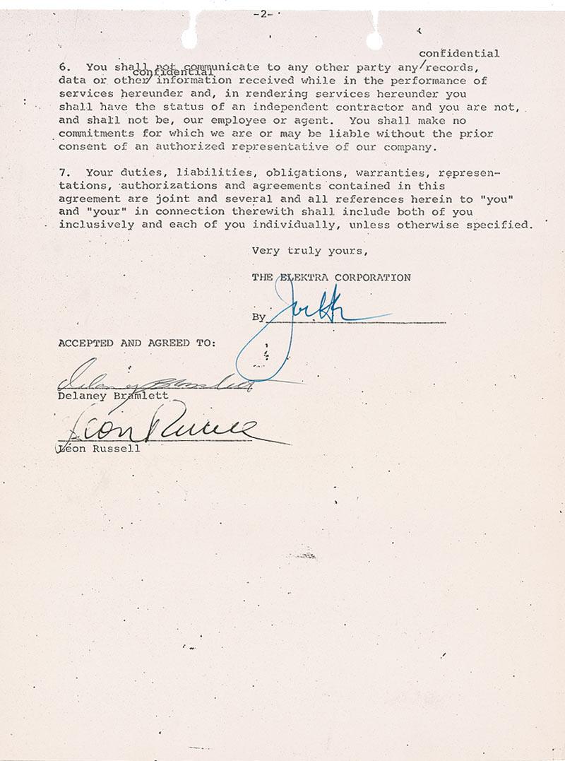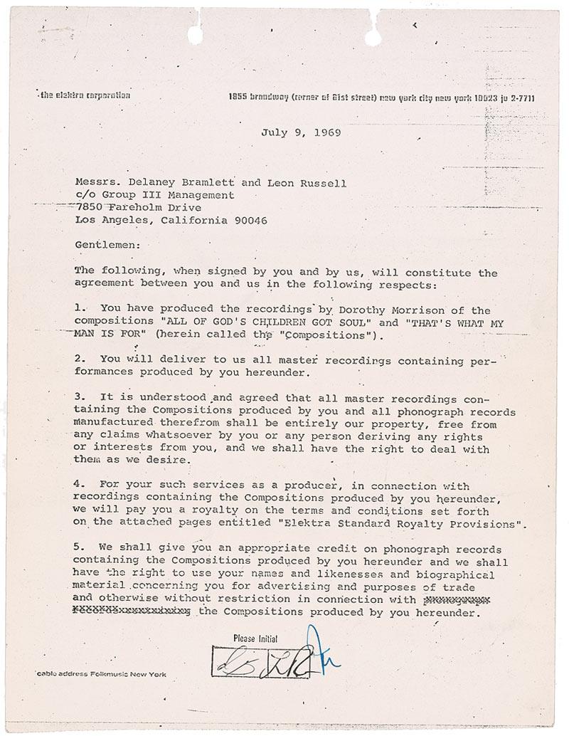 DS, signed “Delaney Bramlett” and “Leon Russell,” four photocopied pages, 8.5 x 11, July 9, 1969. Agreement between Bramlett, Russell, and the Elektra Corporation. In part: “You have produced the records by Dorothy Morrison of the compositions ‘All of God’s Children Got Soul’ and ‘That’s What My Man Is For’…For You such services as a producer, in connection with recordings containing the Compositions produced by you hereunder, we will pay you a royalty on the terms and conditions set forth on the attached pages entitled ‘Elektra Standard Royalty Provisions.’” Bramlett and Russell have each initialed the first, third, and fourth pages as well. In fine condition, with two filing punch holes with small paper tears at the top edge, staple holes at the top left edge, and expected office wear.