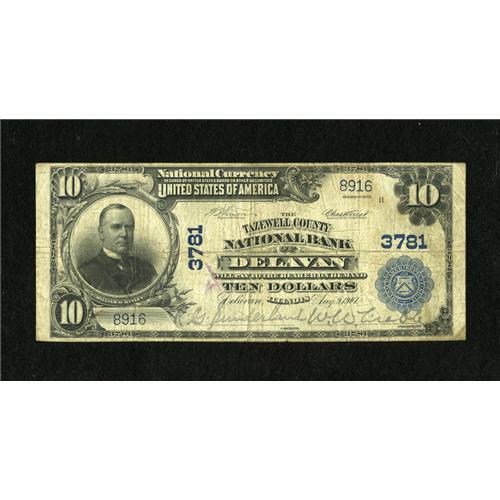 <B>Delavan, IL</B></I> - $10 1902 Plain Back Fr. 626 <B>The Tazewell County NB</B></I> Ch. # 3781<BR>Stamped signatures of the President and Cashier are noted. The paper is solid for the <B>Very Good-Fine</B></I> grade.<BR><I>From The Lincoln Collection</B></I><BR><BR><b>Shipping:</b> Coins & Currency (<a target="_blank" href="http://www.heritageauctions.com/common/shipping.php">view shipping information</a>)