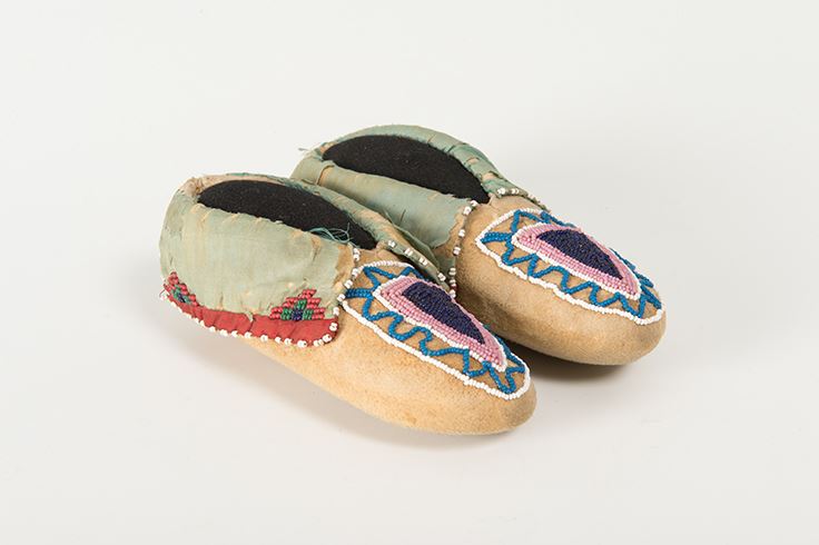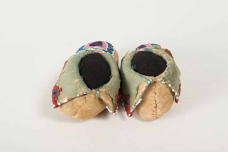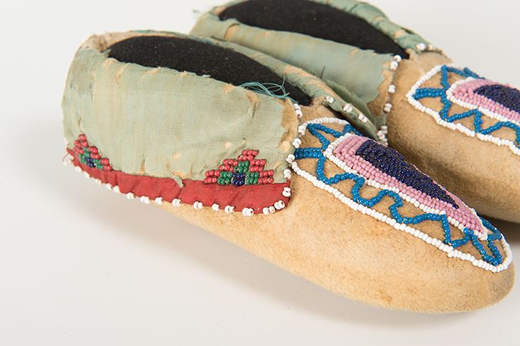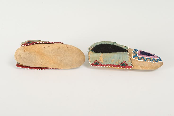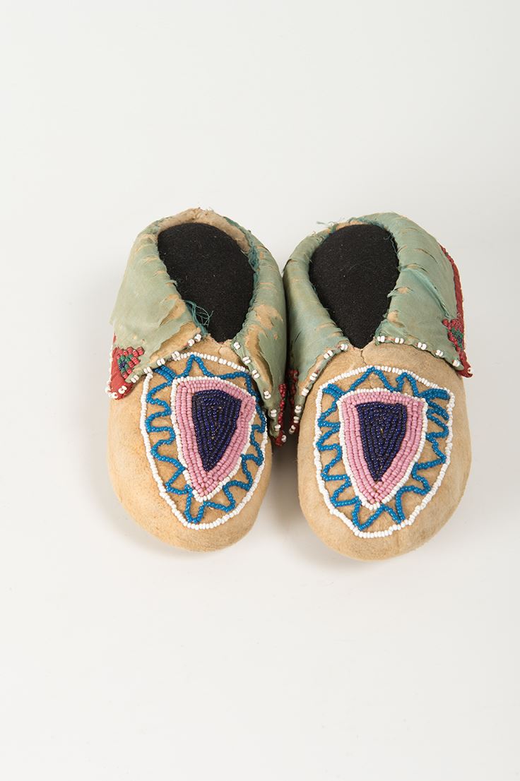 Delaware Beaded Child's Moccasins. 7 " long. Finely beaded pink, blues and yellow beads on vamps and ribbon-worked cuffs. 19th century.