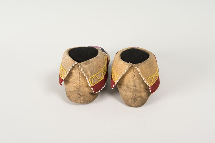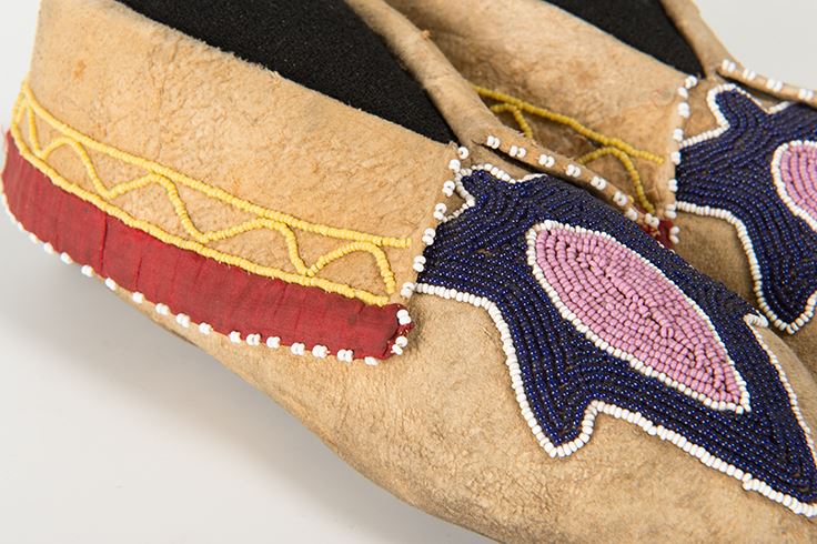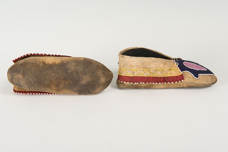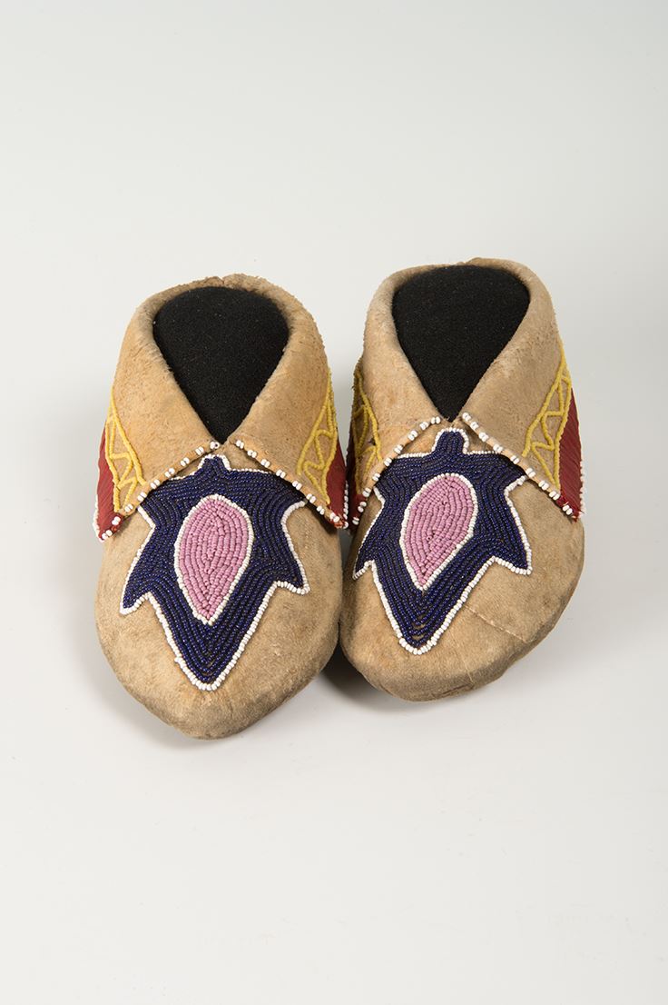Delaware Beaded Woman's Moccasins. 8" long with fine pictorial beadwork on vamps. Beautiful beadwork on cuffs with a white beaded border. 19th century.