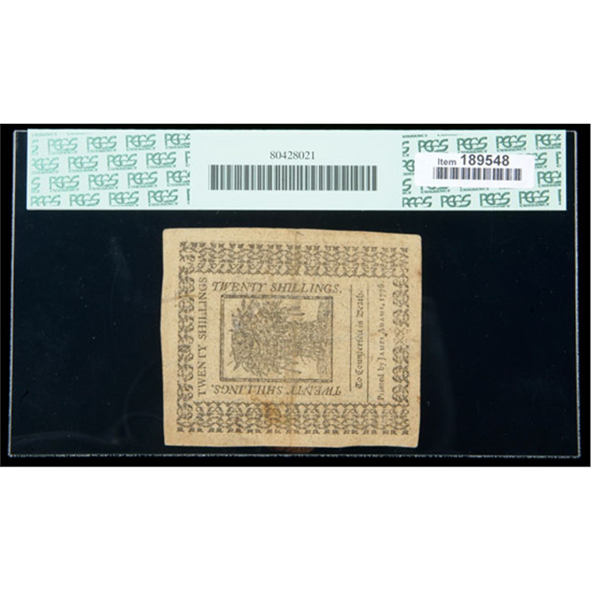 Delaware Jan. 1, 1776 20s. PCGS About New 53PPQ. . Fr-DE-80. This lovely example is about as nice an "AU" Delaware as we can recall seeing. It has four broad margins and is ideally centered on both sides, and the paper and printing quality are outstanding. A single horizontal fold limits the grade, but the eye appeal and originality are above average in every respect.