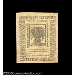 <TABLE cellSpacing=0 cellPadding=0 width="100%" bgColor=#000000 border=0><TBODY> <TR><TD width="100%"><TABLE cellSpacing=1 cellPadding=3 width="100%" border=0><TBODY><TR><TD width="100%" bgColor=#79735c><FONT face=arial color=#ffffff size=3><B>Description</B> </FONT></TD></TR><TR><TD width="100%" bgColor=#ffffff><FONT face=arial size=2><B>Delaware January 1 1776 10s Choice About New.</B></I> The appearance of a absolute gem with huge margins, perfect centering and bold signatures. The note has one light fold. (225--up) </FONT></TD></TR></TBODY></TABLE></TD></TR></TBODY></TABLE><BR><TABLE cellSpacing=0 cellPadding=0 width="100%" bgColor=#000000 border=0><TBODY><TR> Important notice: Heritage usually auctions material at the rate of 200-250 lots per hour. On some occasions eBay Live bid software or the Internet may not be able to keep up with the pace of the auction. We recommend placing a realistic absentee bid now as insurance to avoid disappointment. Occasionally the auctioneer may eliminate or reject an eBay Live bid, and the auctioneer may also reopen a lot after the close of the eBay live bidding (usually because we missed an audience bid), and may reject your bid even if it shows you as the winning bidder. By bidding via eBay Live, you agree that Heritage may award the lot to another bidder at its sole discretion under the circumstances described above or any other reasonable circumstances. Also please note that all Heritage lots purchased through eBay Live carry a 20% Buyer's Premium. Please make sure you read the Terms and Conditions before you bid.</TR></TBODY></TABLE>