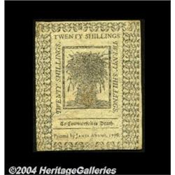 Delaware January 1, 1776 20s Choice About New. Rather closely margined, and with minor mounting marks on the back. <BR><BR><B>Important notice:</B> Heritage usually auctions material at the rate of 200-250 lots per hour. On some occasions eBay Live bid software or the Internet may not be able to keep up with the pace of the auction. We recommend placing a realistic absentee bid now as insurance to avoid disappointment. Occasionally the auctioneer may eliminate or reject an eBay Live bid, and the auctioneer may also reopen a lot after the close of the eBay live bidding (usually because we missed an audience bid), and may reject your bid even if it shows you as the winning bidder. By bidding via eBay Live, you agree that Heritage may award the lot to another bidder at its sole discretion under the circumstances described above or any other reasonable circumstances. Since eBay bids are not shown to us until we open the lot on the floor, we treat those bids just like floor bids. In most cases the floor responds before the eBay bid is presented to us, due to Internet lag time, so for consistency we have made it a policy that floor bids are always considered first over tie eBay live bids. Also please note that all Heritage lots purchased through eBay Live carry a 20% Buyer's Premium. Please make sure you read the Terms and Conditions before you bid. <BR><BR><B>IMPORTANT ANNOUNCEMENT ABOUT RESERVES:</B> Heritage now divulges all reserves on its web site 7 days before every auction. If you want to know whether the reserve on this lot has been met, and if not, what the reserve amount is, please visit this lot page on the HeritageCoin.com web site, or email: bid@HeritageGalleries.com