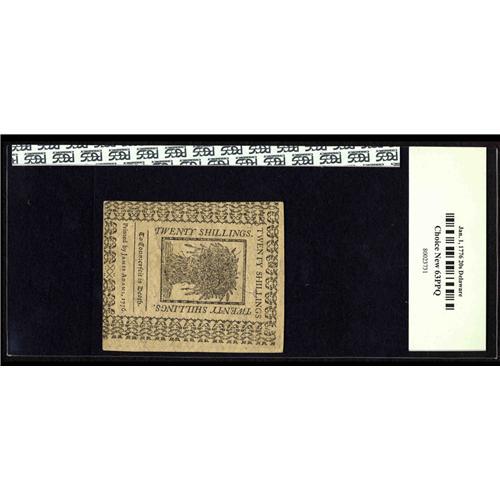 <B>Delaware January 1, 1776 20s PCGS Choice New 63PPQ.</B></I> Full margins around the face design and perfect signatures add allure to this piece of Colonial history.