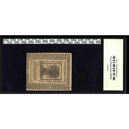 <B>Delaware January 1, 1776 20s PCGS Very Choice New 64PPQ.</B></I> The only grade limiting factor on this note is lightly toned paper. The signatures are strong, the margins are solid and the note is wholly original.