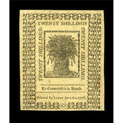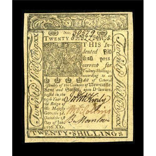 <B>Delaware January 1, 1776 20s Very Choice New.</B></I> This is the highest denomination for this issue. This example displays bold signatures, superior paper surfaces, and margins that are just a touch from Gem.<BR><BR><b>Shipping:</b> Coins & Currency (<a target="_blank" href="http://www.heritageauctions.com/common/shipping.php">view shipping information</a>)