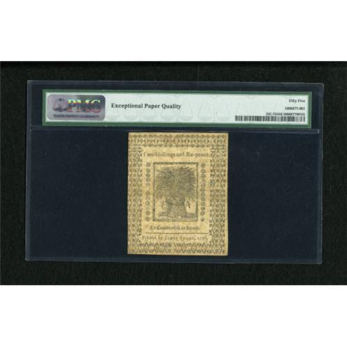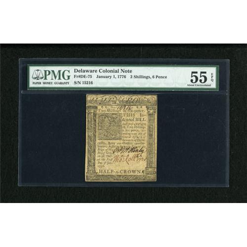 <B>Delaware January 1, 1776 2s/6d PMG About Uncirculated 55 EPQ.</B></I> A slightly heavier centerfold is all that separates this Delaware issue from the Choice New grade.<BR><BR><b>Shipping:</b> Coins & Currency (<a target="_blank" href="http://www.heritageauctions.com/common/shipping.php">view shipping information</a>)