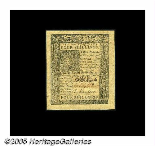 <B>Delaware January 1, 1776 4s Superb Gem New.</B></I> An utterly unimprovable example of the type with huge, even margins, bold, sharp printing and three dark, clear signatures in three different colors. This is not a rare note, but this is one of the finest examples of the type that this cataloger has ever seen. It's incredibly bright and original, and its surfaces literally sparkle with the multiple mica flecks imbedded in its paper as an anticounterfeiting device. Colonial Currency from any issue is indeed rare this nice, and this cataloger believes the entire category of Colonial to be far undervalued on today's market. From a cut double sheet that we offered a few years ago.